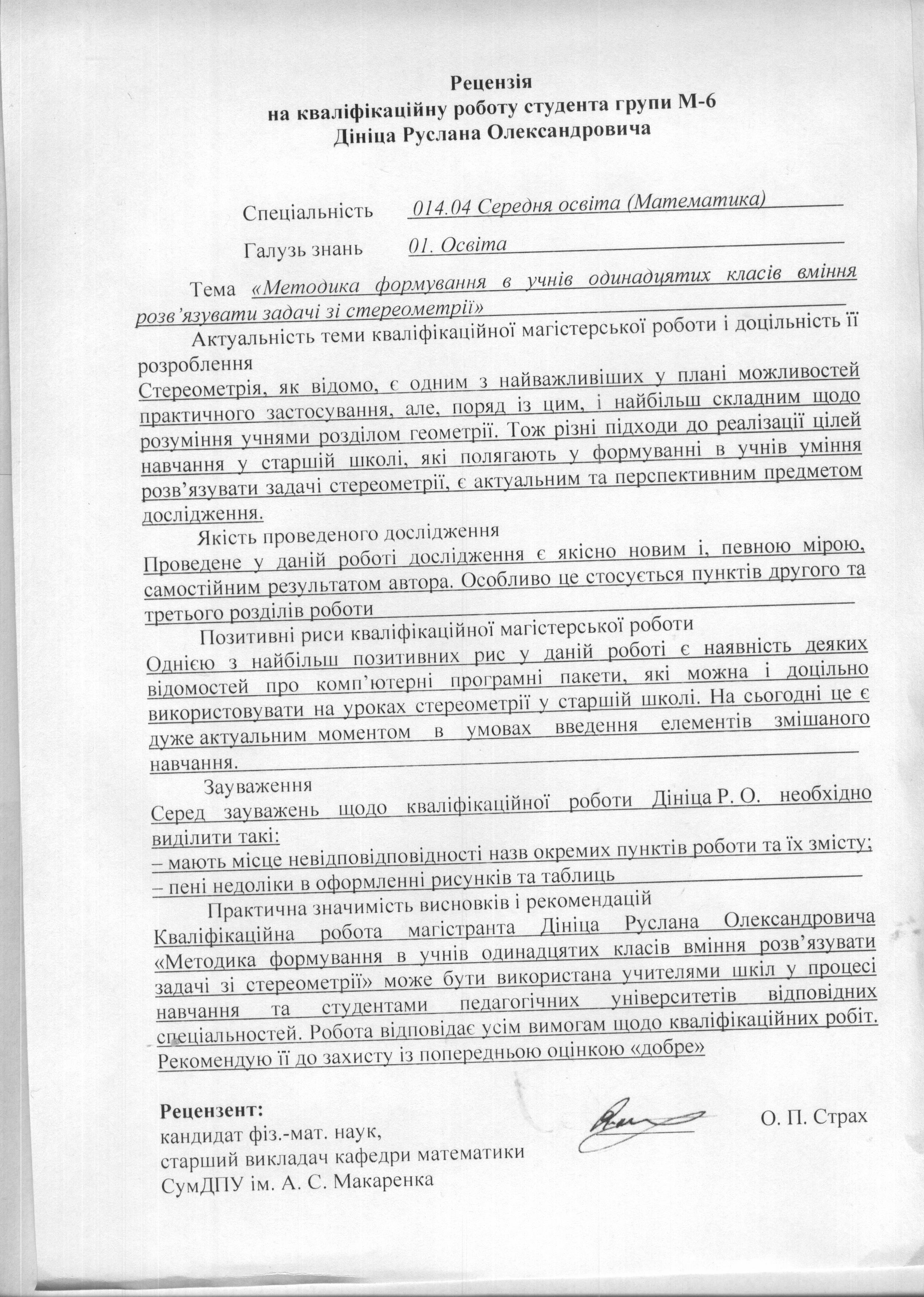 Дініц, Р. О. Методика формування в учнів одинадцятих класів вміння розв’язувати задачі зі стереометрії [Текст] : магістер. робота / Р. О. Дініц ; науковий керівник Ю. В. Хворостіна. – Суми : СумДПУ ім. А. С. Макаренка, 2020. – 63 с.