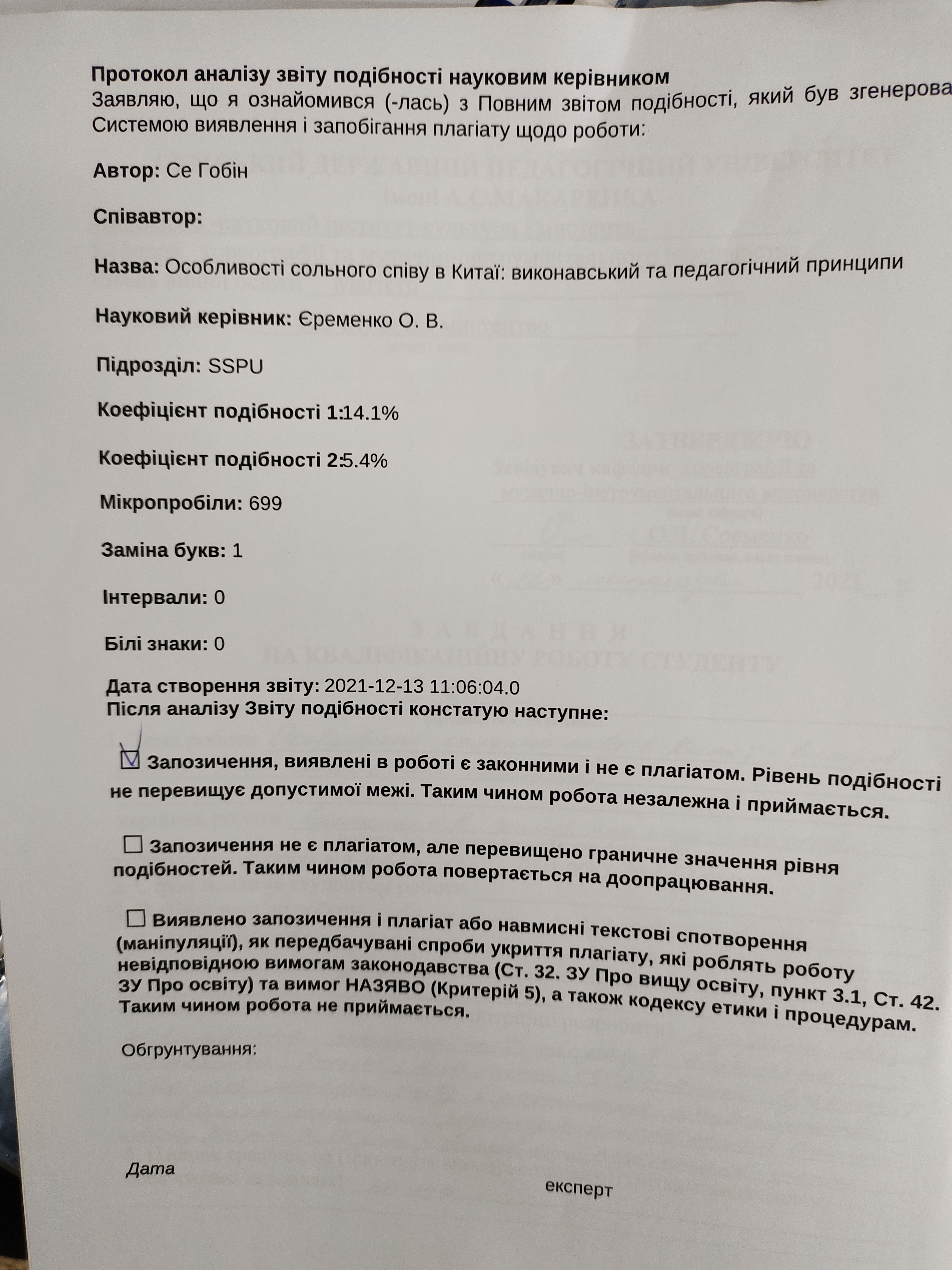 Се Гобін Особливості сольного співу в Китаї: виконавський та педагогічний принципи [Текст] : кваліфікаційна робота на здобуття освітнього ступеня магістр / Се Гобін, науковий керівник О. В. Єременко. – Суми : СумДПУ ім. А. С. Макаренка, 2021. – 59 с.