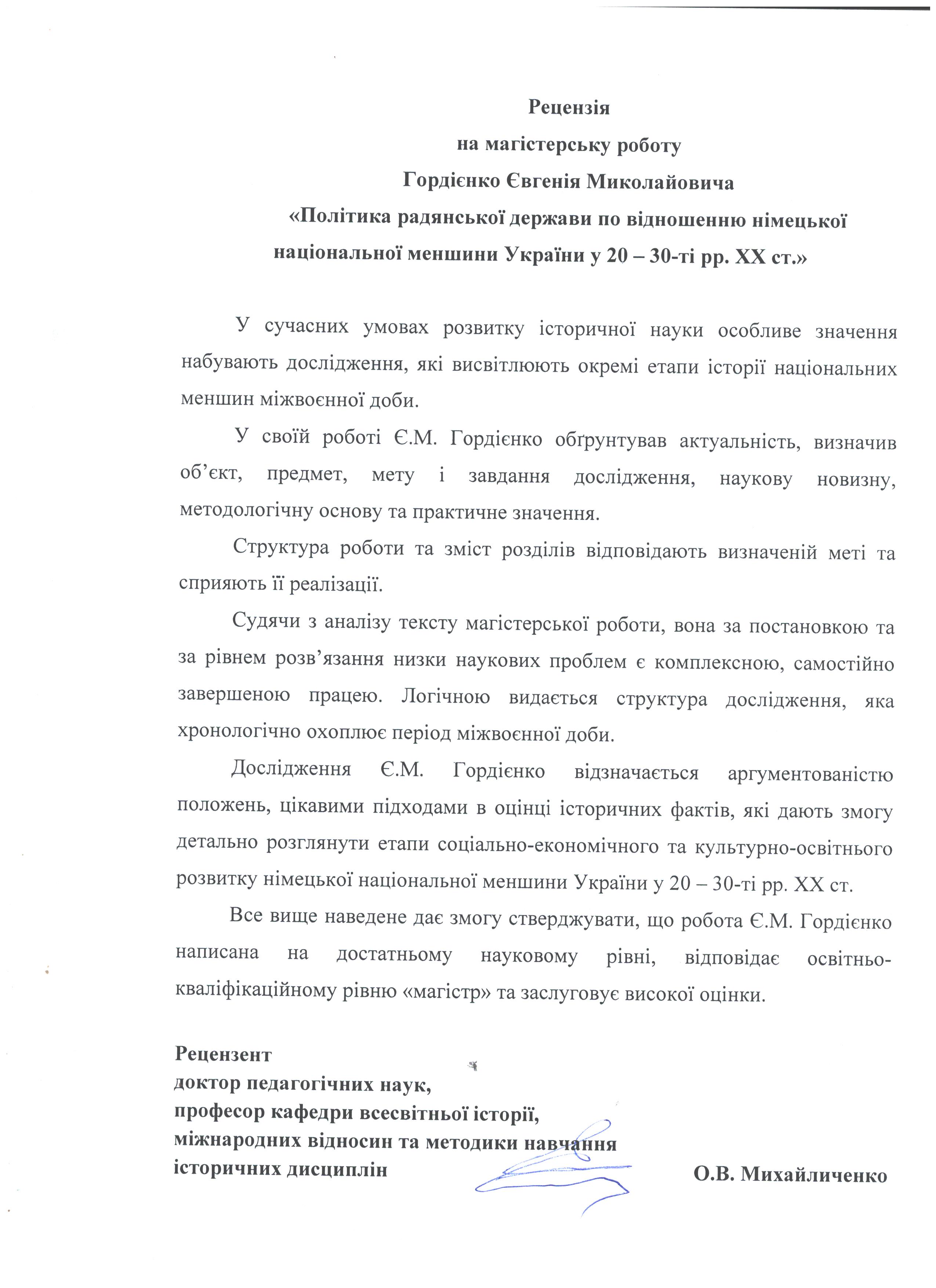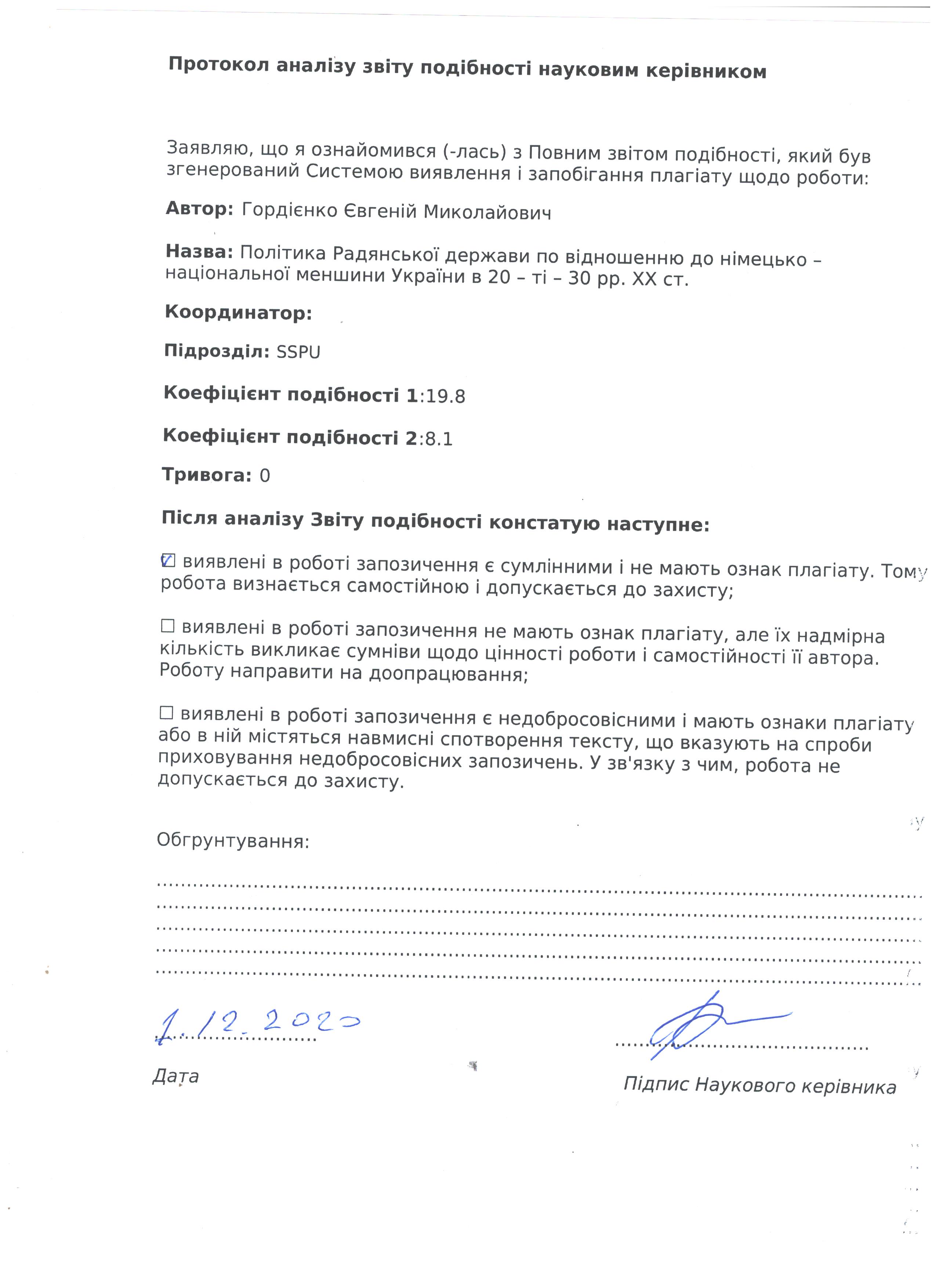 Гордієнко, Є. М. Політика радянської держави по відношенню до німецької національної меншини України у 20-30-ті рр. ХХ ст. [Текст] : магістер. робота / Є. М. Гордієнко ; науковий керівник В. В. Турков. – Суми : СумДПУ ім. А. С. Макаренка, 2020. – 71 с.