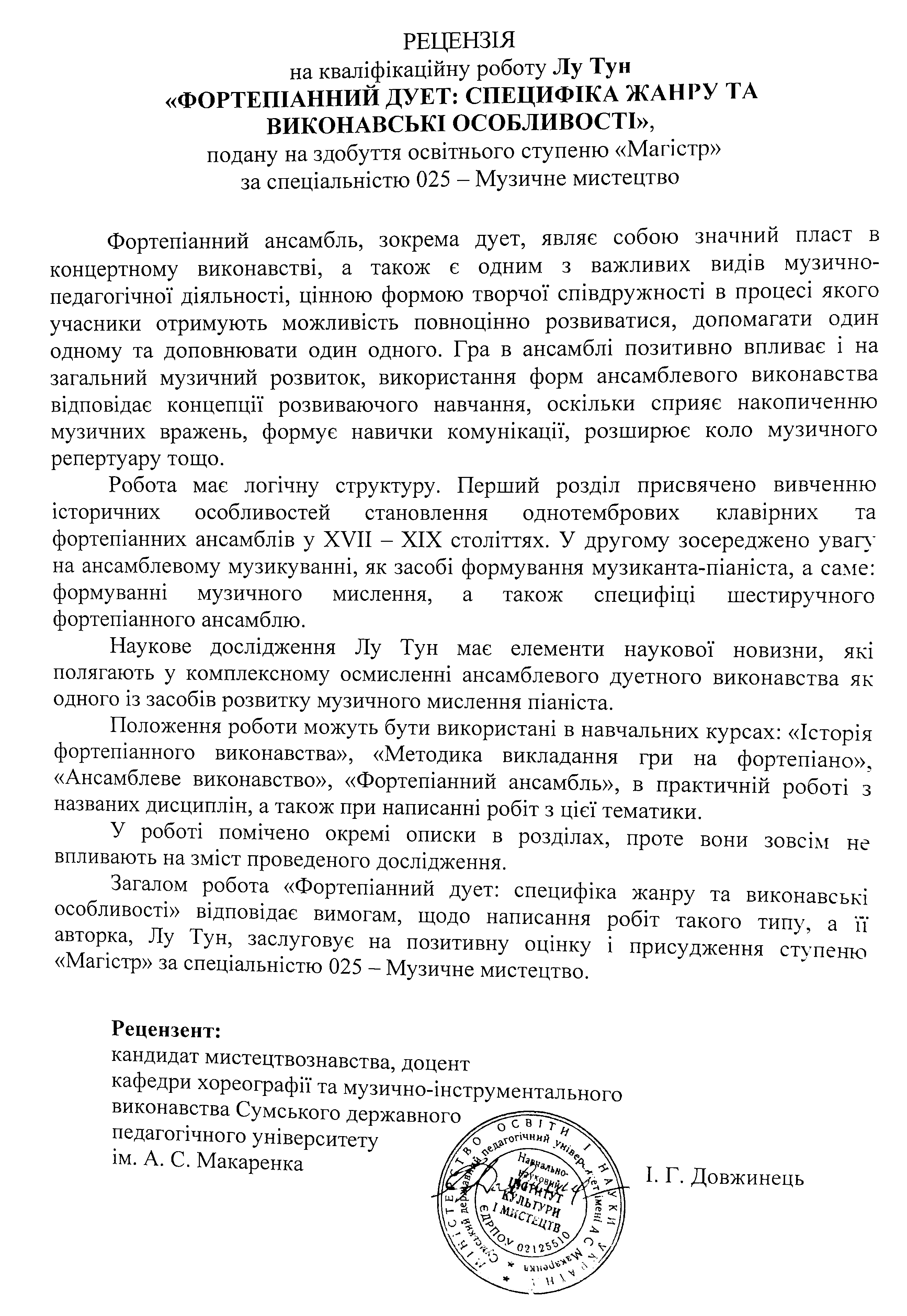 Лу Тун Фортепіанний дует: специфіка жанру та виконавські особливості [Текст] : магістер. робота / Лу Тун ; науковий керівник Г. П. Голяка. – Суми : СумДПУ ім. А. С. Макаренка, 2020. – 65 с.
