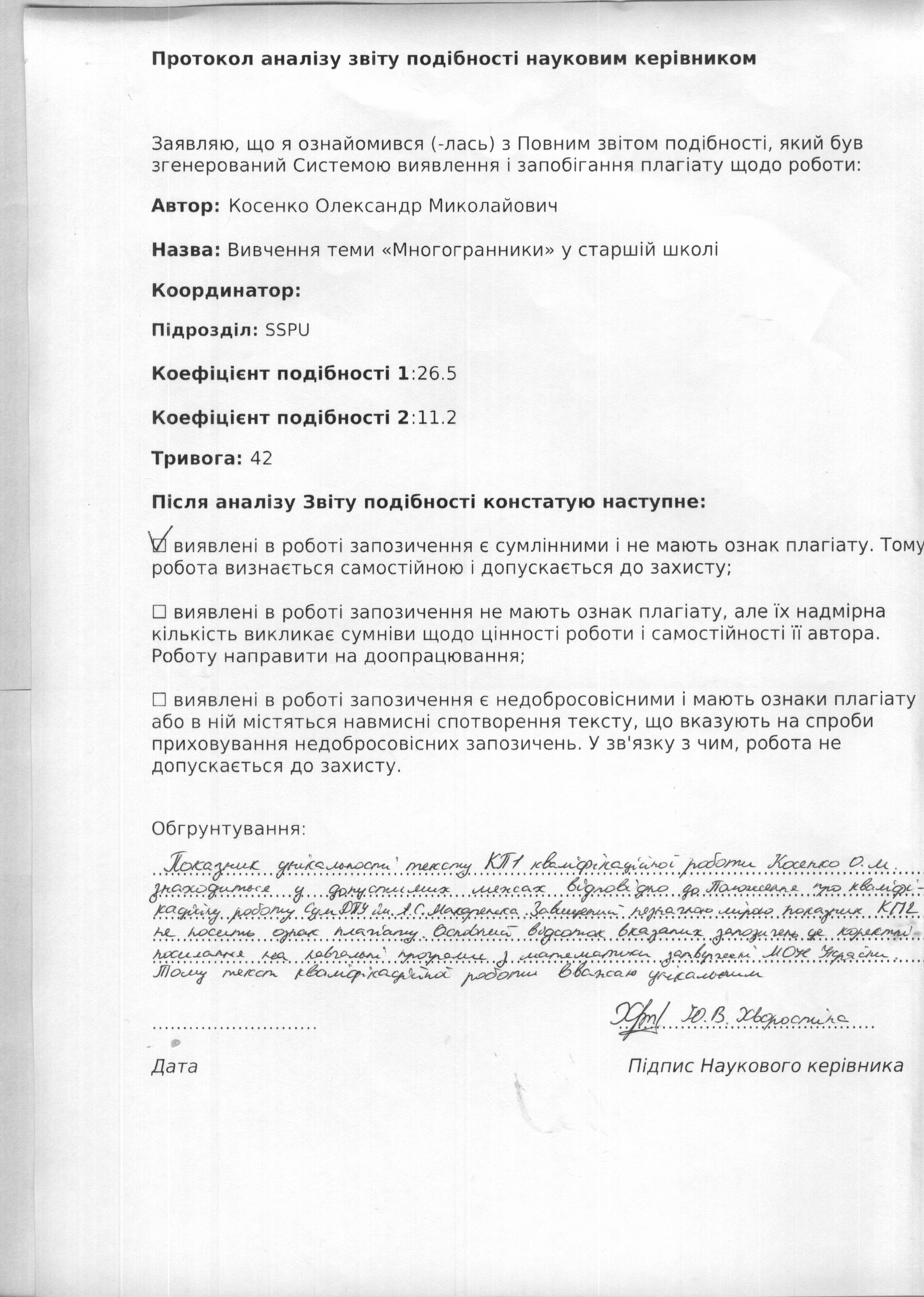 Косенко, О. М. Вивчення теми «Многогранники» у старшій школі [Текст] : магістер. робота / О. М. Косенко ; науковий керівник Ю. В. Хворостіна. – Суми : СумДПУ ім. А. С. Макаренка, 2020. – 95 с.