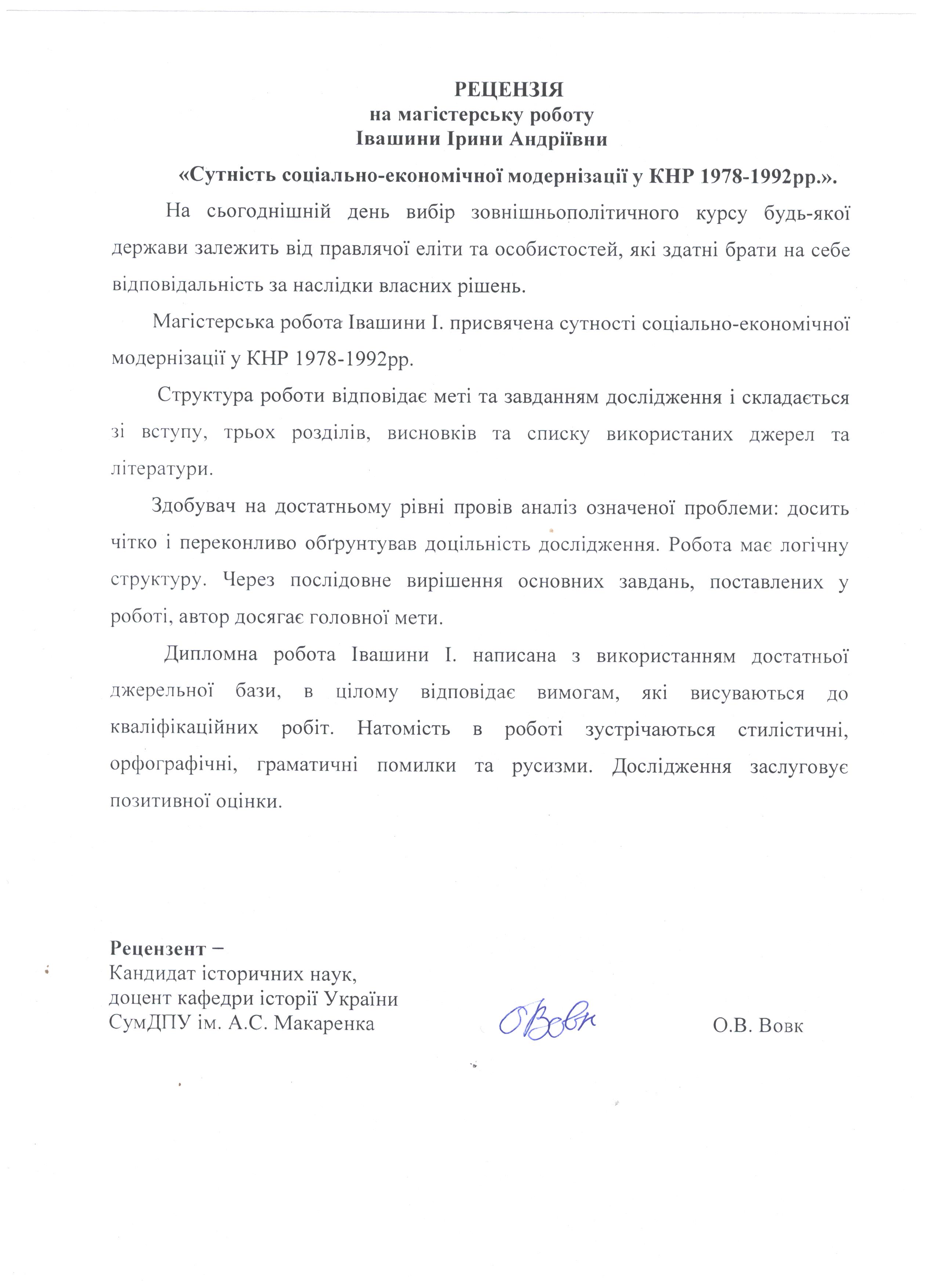 Івашина, І. А. Сутність соціально-економічної модернізації у КНР 1978-1992 рр. [Текст] : магістер. робота / І. А. Івашина ; науковий керівник В. В. Сокирська. – Суми : СумДПУ ім. А. С. Макаренка, 2021. – 56 с.