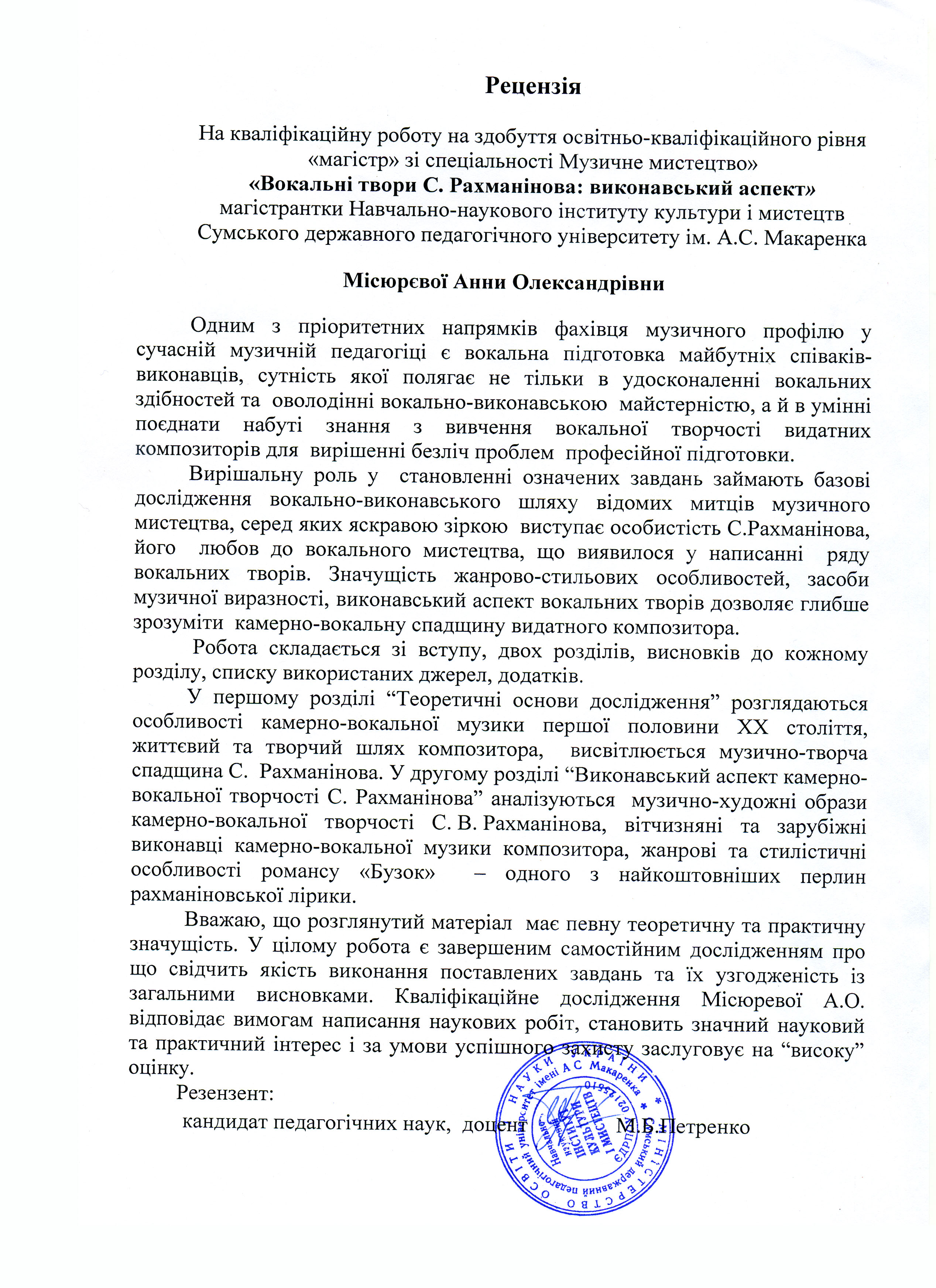 Мicюpєвa, А. О. Вокальні твори С. Рахманінова: виконавський аспект [Текст] : магістер. робота / А. О. Мicюpєвa ; науковий керівник Л. А. Бірюкова. – Суми : СумДПУ ім. А. С. Макаренка, 2020. – 71 с.