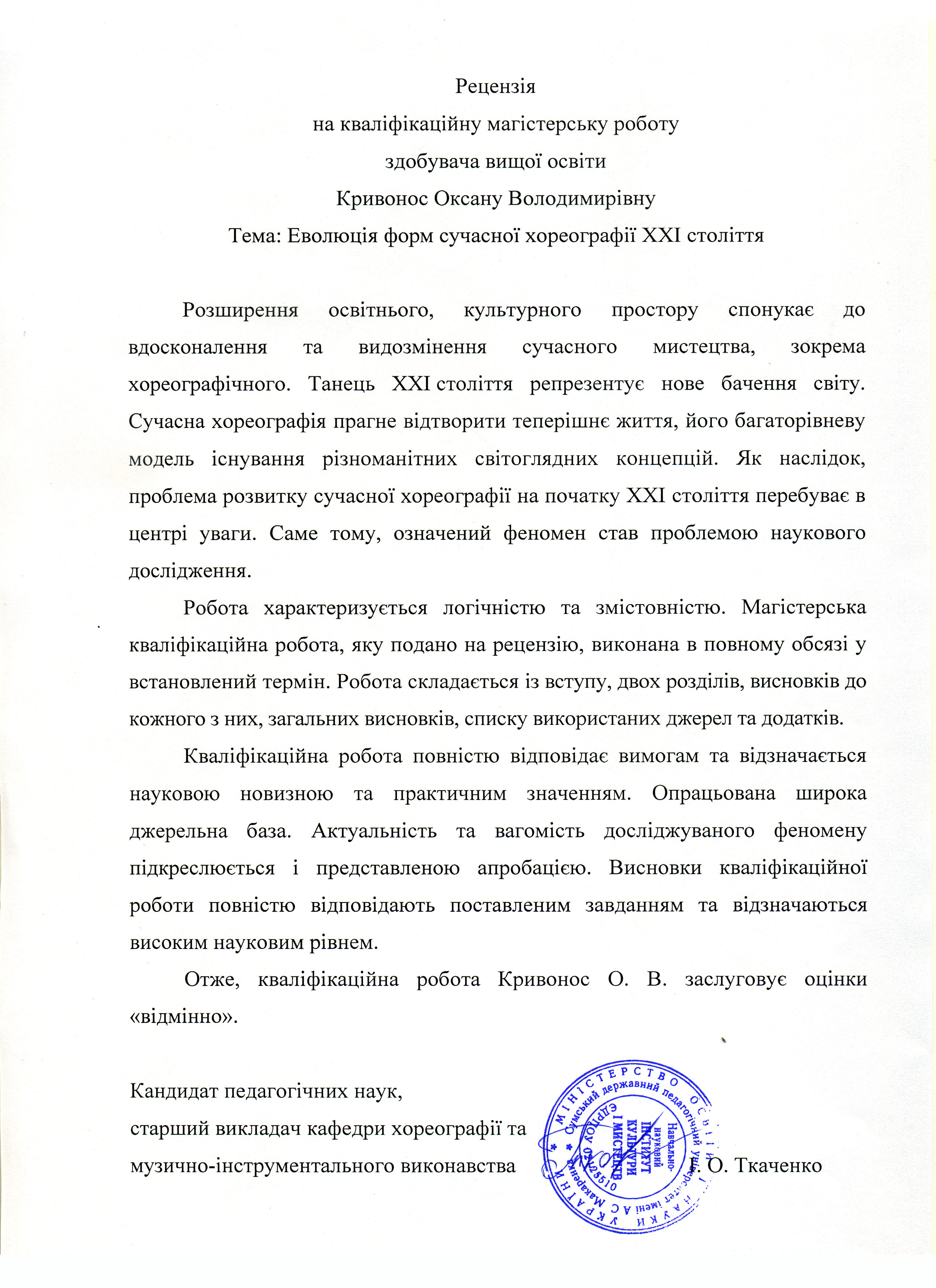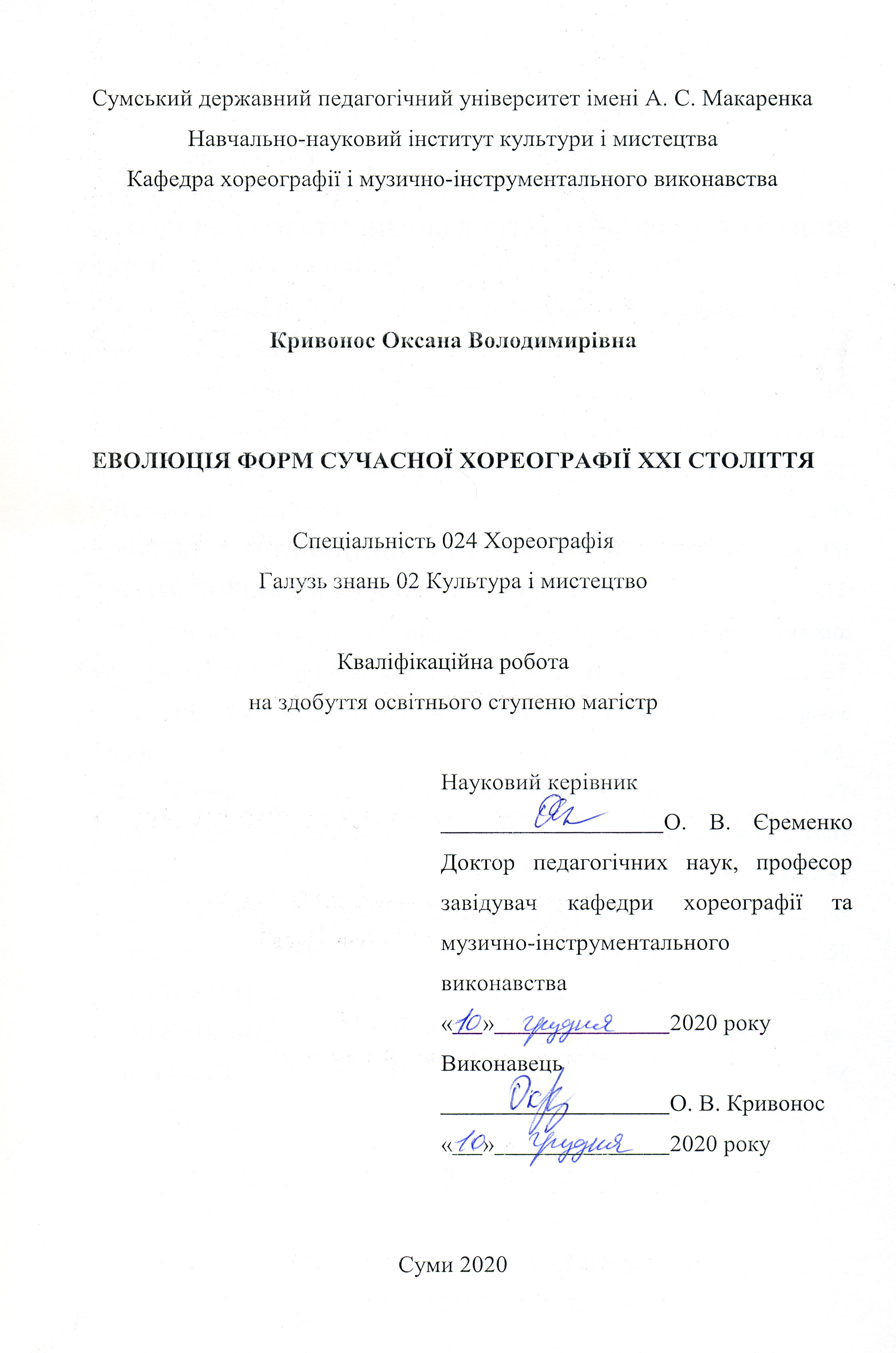 | dc.identifier.citation | Кривонос, О. В. Еволюція форм сучасної хореографії ХХІ століття [Текст] : магістер. робота / О. В. Кривонос ; науковий керівник О. В. Єременко. – Суми : СумДПУ ім. А. С. Макаренка, 2020. – 71 с. | uk_UA |