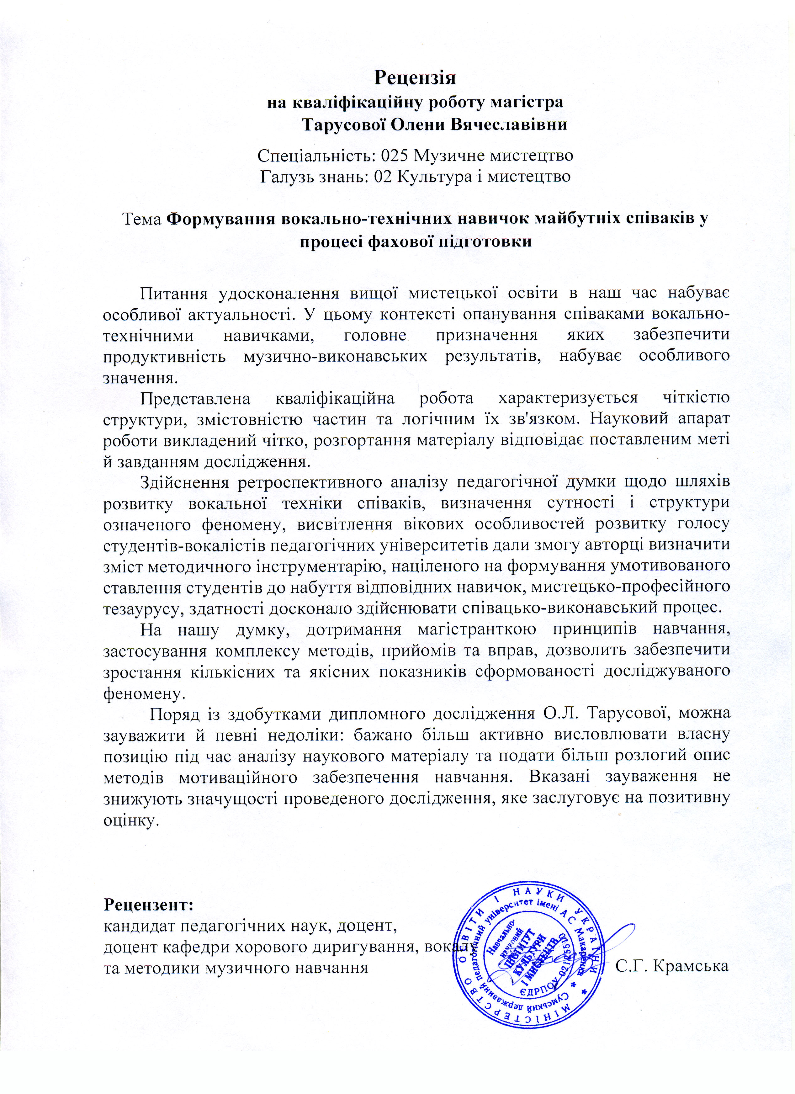 Тарусова, О. В. Формування вокально-технічних навичок майбутніх співаків у процесі фахової підготовки [Текст] : магістер. робота / О. В. Тарусова ; науковий керівник М. Б. Петренко. – Суми : СумДПУ ім. А. С. Макаренка, 2020. – 73 с.
