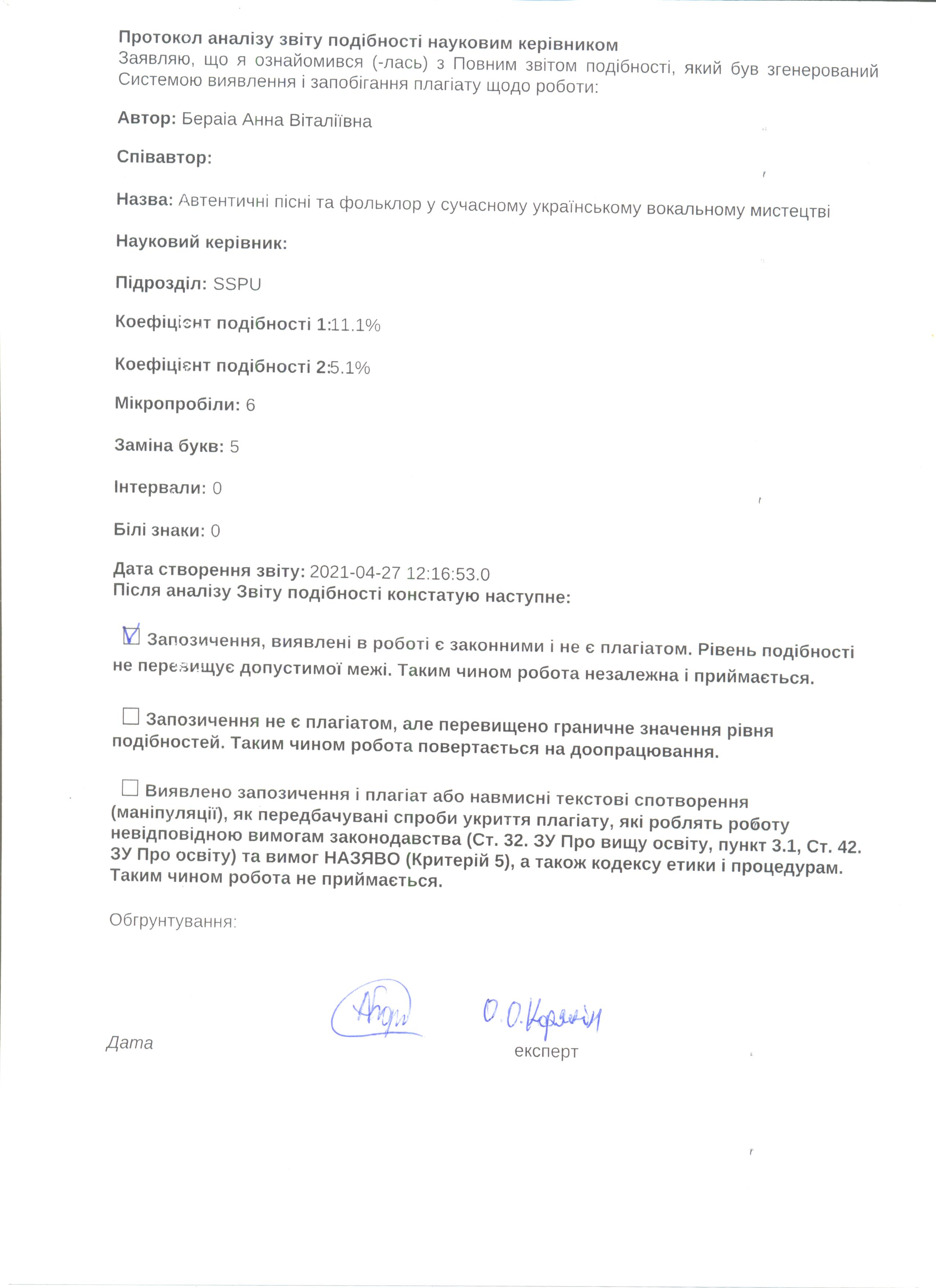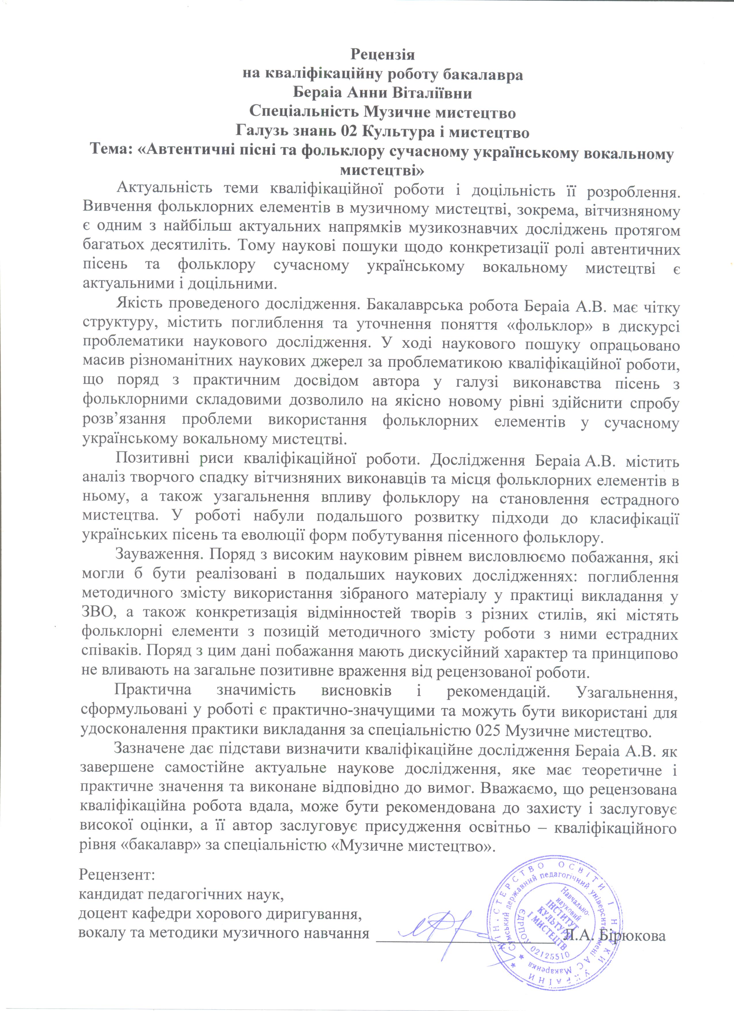 Бераіа, А. В. Автентичні пісні та фольклор у сучасному українському вокальному мистецтві [Текст] : бакалавр. робота / А. В. Бераіа ; науковий керівник О. О. Корякін. – Суми : СумДПУ ім. А. С. Макаренка, 2021. – 45 с.