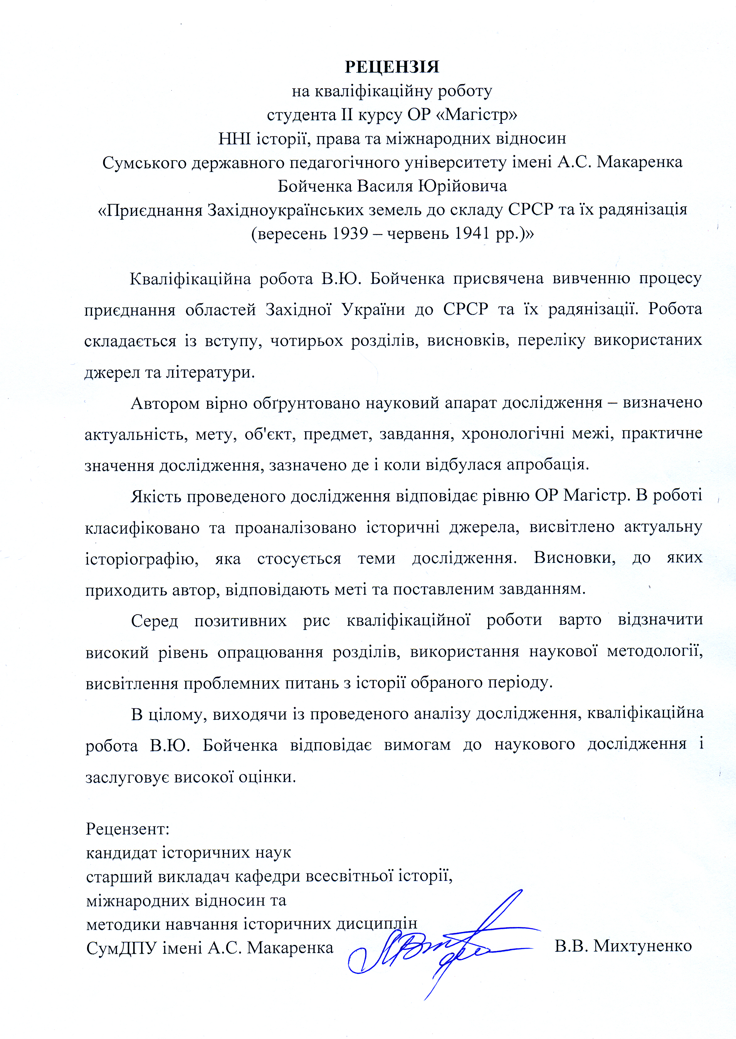 Бойченко, В. Ю. Приєднання західноукраїнських земель до складу СРСР та їх радянізація (вересень 1939 – червень 1941 рр.) [Текст] : магістер. робота / В. Ю. Бойченко ; науковий керівник В. В. Турков. – Суми : СумДПУ ім. А. С. Макаренка, 2021. – 65 с.
