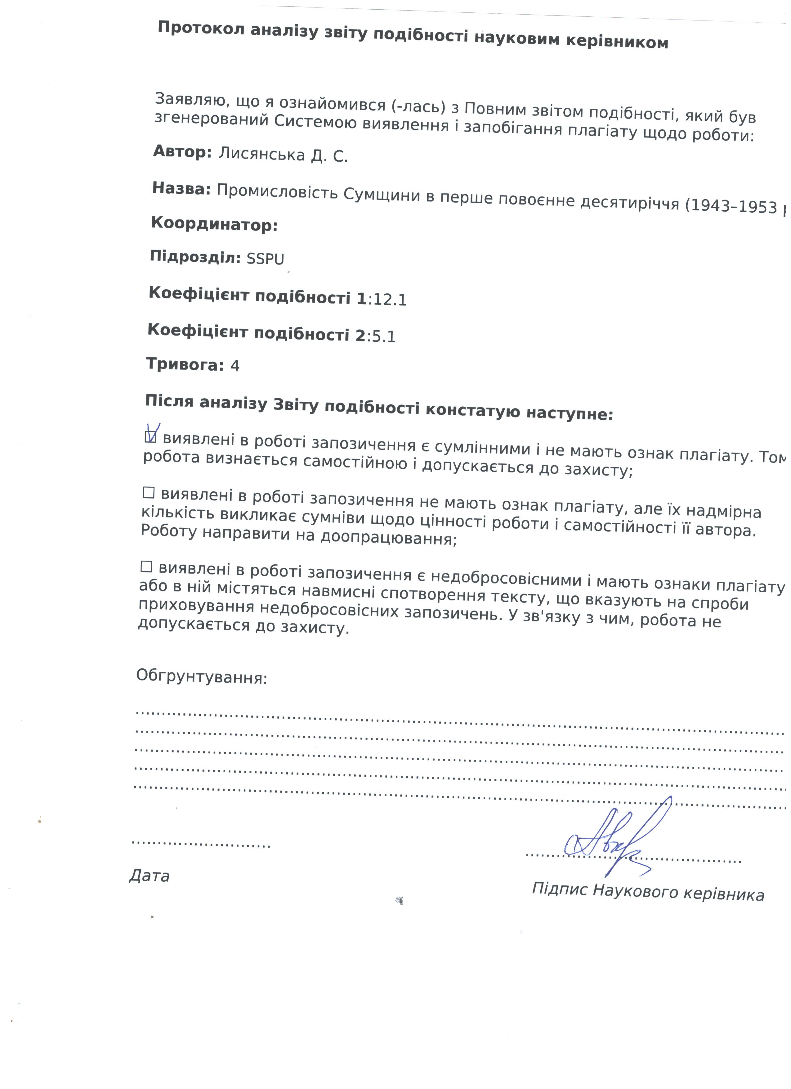 Лисянська, Д. С. Промисловість Cумщини в перше повоєнне десятиріччя (1943–1953 рр.) [Текст] : магістер. робота / Д. С. Лисянська ; науковий керівник С. О. Авхутська. – Суми : СумДПУ ім. А. С. Макаренка, 2020. – 77 с.