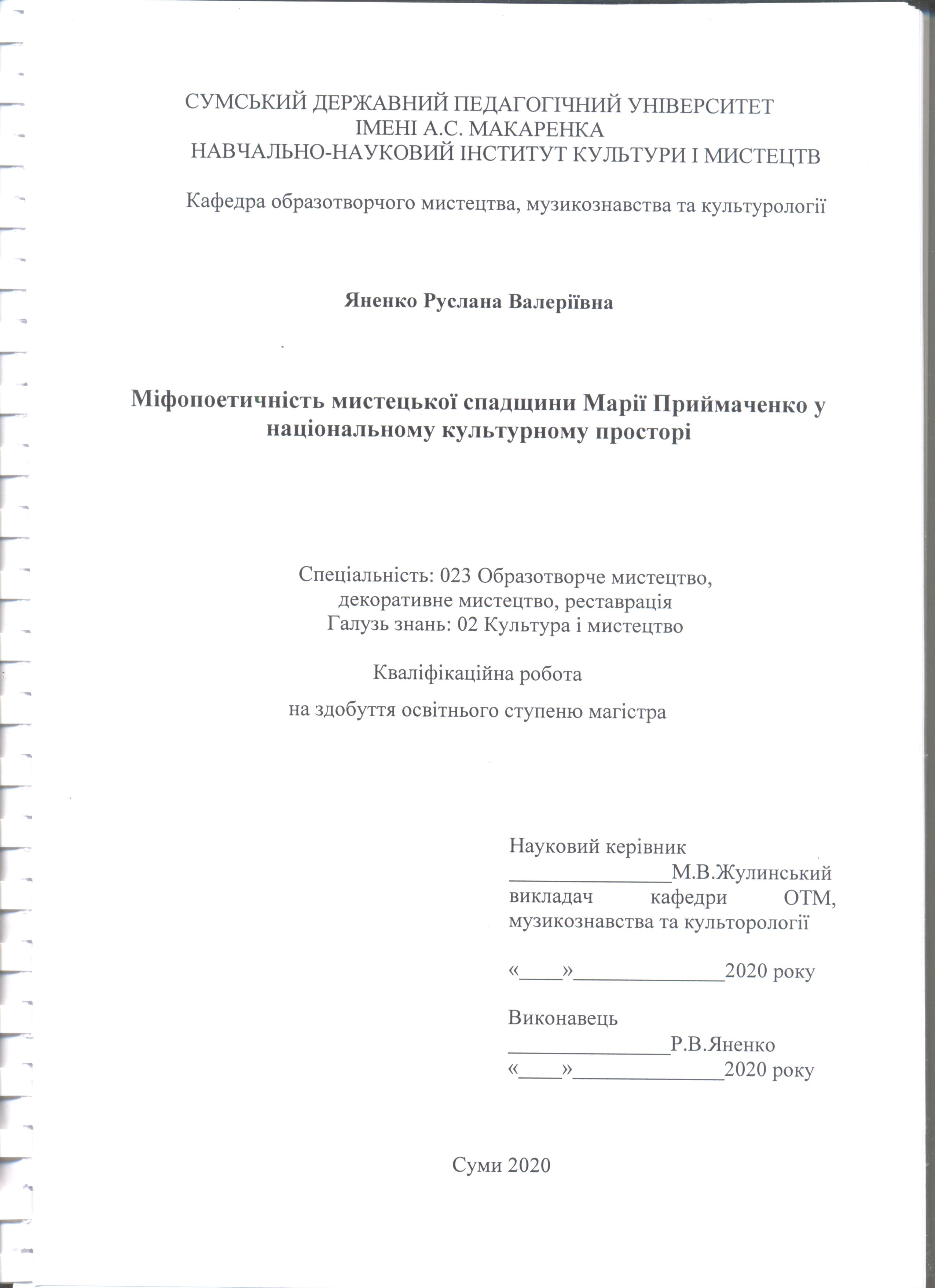 | dc.identifier.citation | Яненко, Р. В. Міфопоетичність мистецької творчості Марії Приймаченко у національному культурологічному просторі [Текст] : магістер. робота / Р. В. Яненко ; науковий керівник М. В. Жулінський. – Суми : СумДПУ ім. А. С. Макаренка, 2020. – 88 с. | uk_UA |