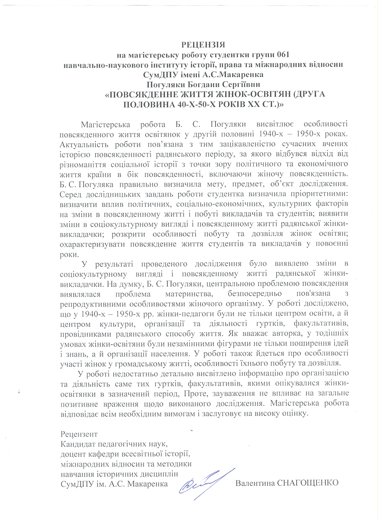 Погуляка, Б. С. Повсякденне життя жінок-освітян (друга половина 40-х-50-х років ХХ століття) [Текст] : магістер. робота / Б. С. Погуляка ; науковий керівник О. В. Вовк. – Суми : СумДПУ ім. А. С. Макаренка, 2021. – 77 с.