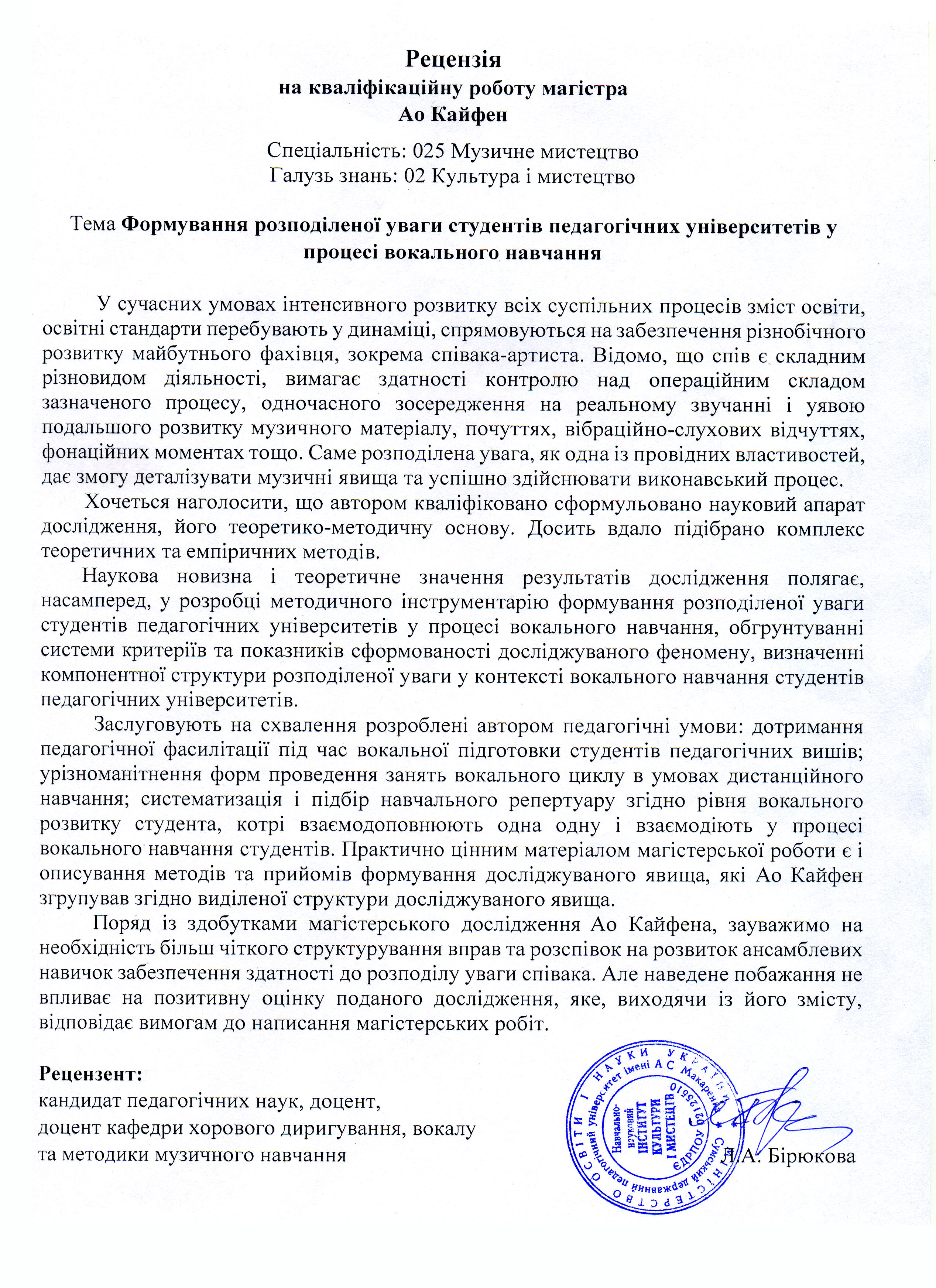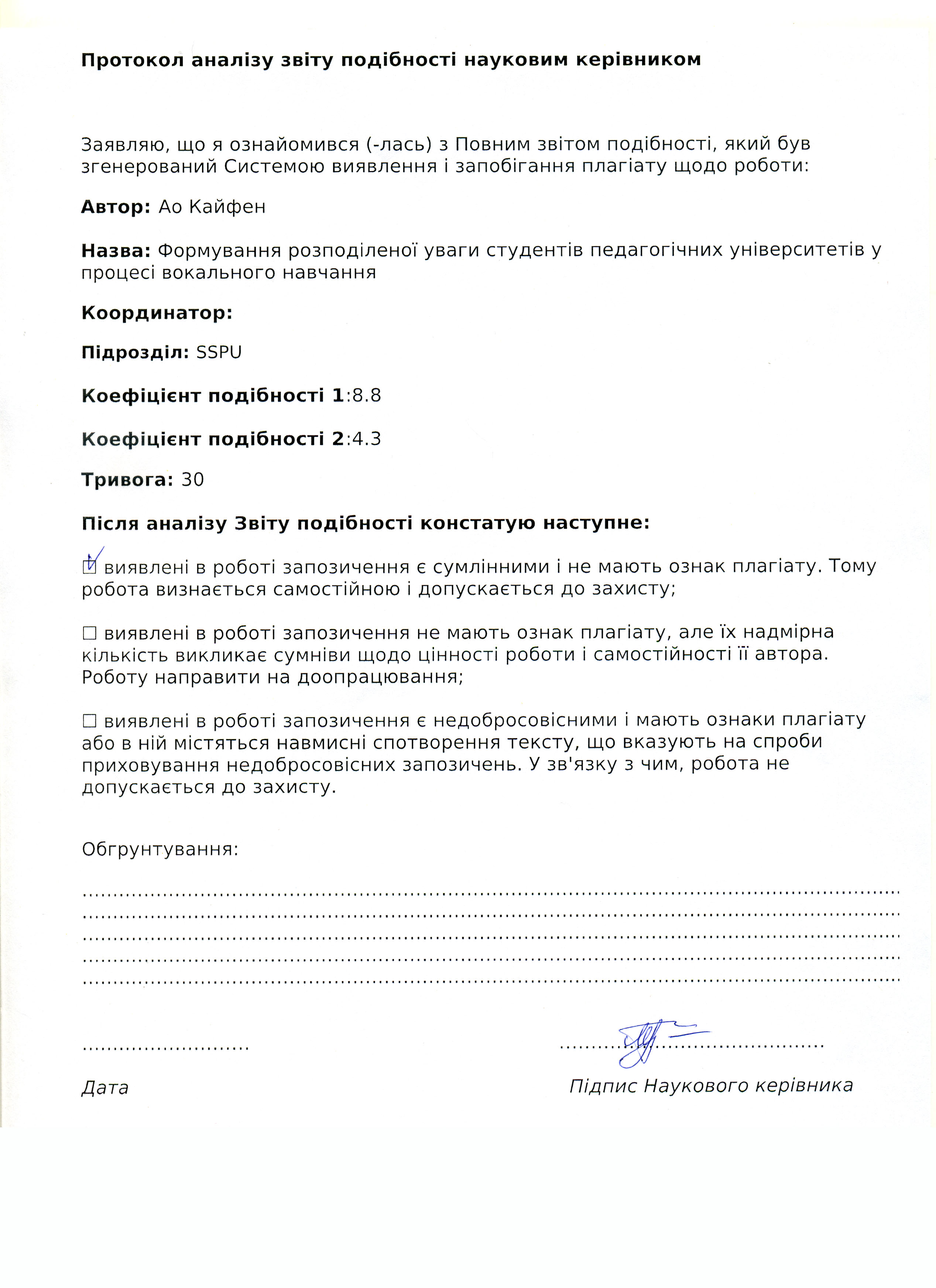 Ао Кайфен Формування розподіленої уваги студентів педагогічних університетів у процесі вокального навчання [Текст] : магістер. робота / Ао Кайфен ; науковий керівник М. Б. Петренко. – Суми : СумДПУ ім. А. С. Макаренка, 2020. – 82 с.