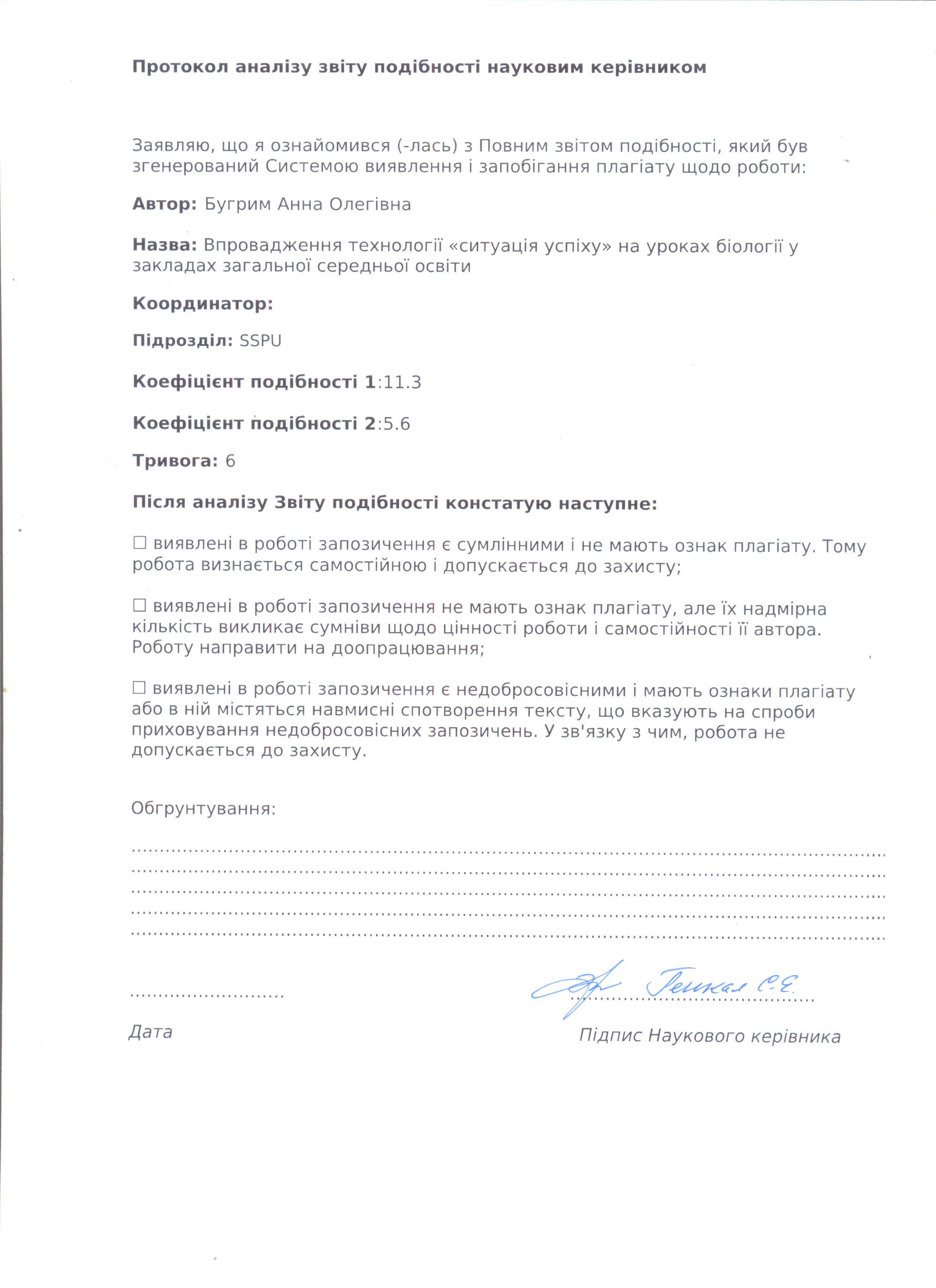Бугрим, А. О. Впровадження технології «ситуація успіху» на уроках біології у закладах загальної середньої освіти [Текст] : магістер. робота / А. О. Бугрим ; науковий керівник С. Е. Генкал. – Суми : СумДПУ ім. А. С. Макаренка, 2020. – 76 с.