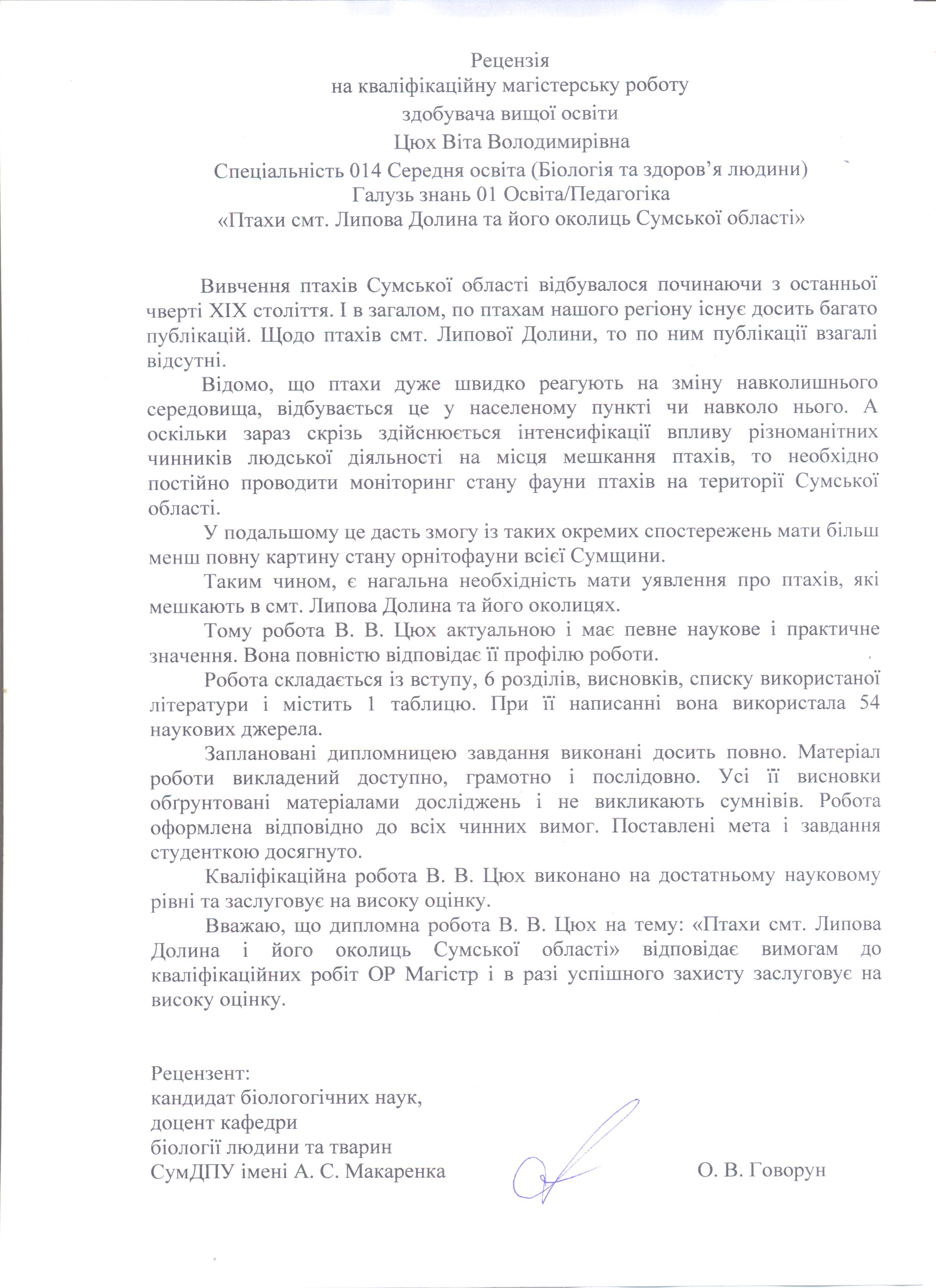 Цюх, В. В. Птахи смт. Липова Долина та його околиць Сумської області [Текст] : магістер. робота / В. В. Цюх ; науковий керівник І. Р. Мерзлікін. – Суми : СумДПУ ім. А. С. Макаренка, 2020. – 86 с.
