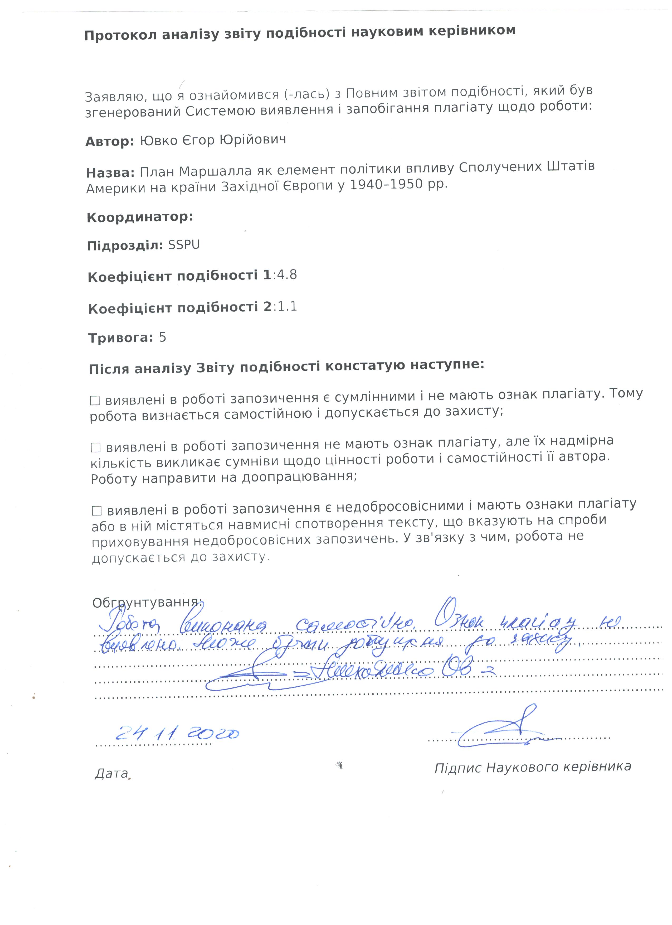 | dc.identifier.citation | Ювко, Є. Ю. План Маршалла як елемент політики впливу Сполучених Штатів Америки на країни Західної Європи у 1940-1950 р.р. [Текст] : магістер. робота / Є. Ю. Ювко ; науковий керівник О. В. Михайличенко. – Суми : СумДПУ ім. А. С. Макаренка, 2020. – 78 с. | uk_UA |