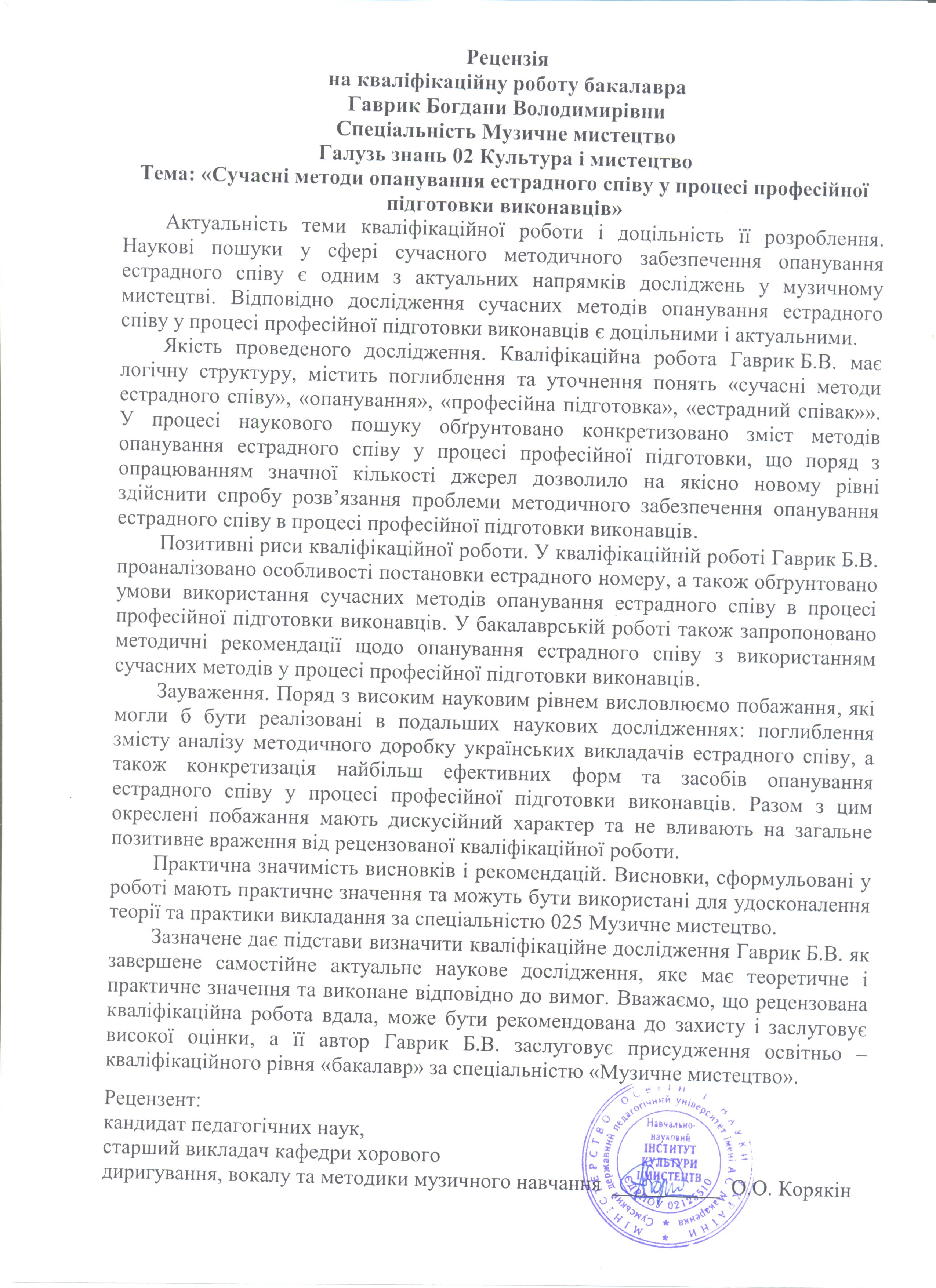 Гаврик, Б. В. Сучасні методи опанування естрадного співу у процесі професійної підготовки виконавців [Текст] : бакалавр. робота / Б. В. Гаврик ; науковий керівник Н. А. Фоломєєва. – Суми : СумДПУ ім. А. С. Макаренка, 2021. – 62 с.