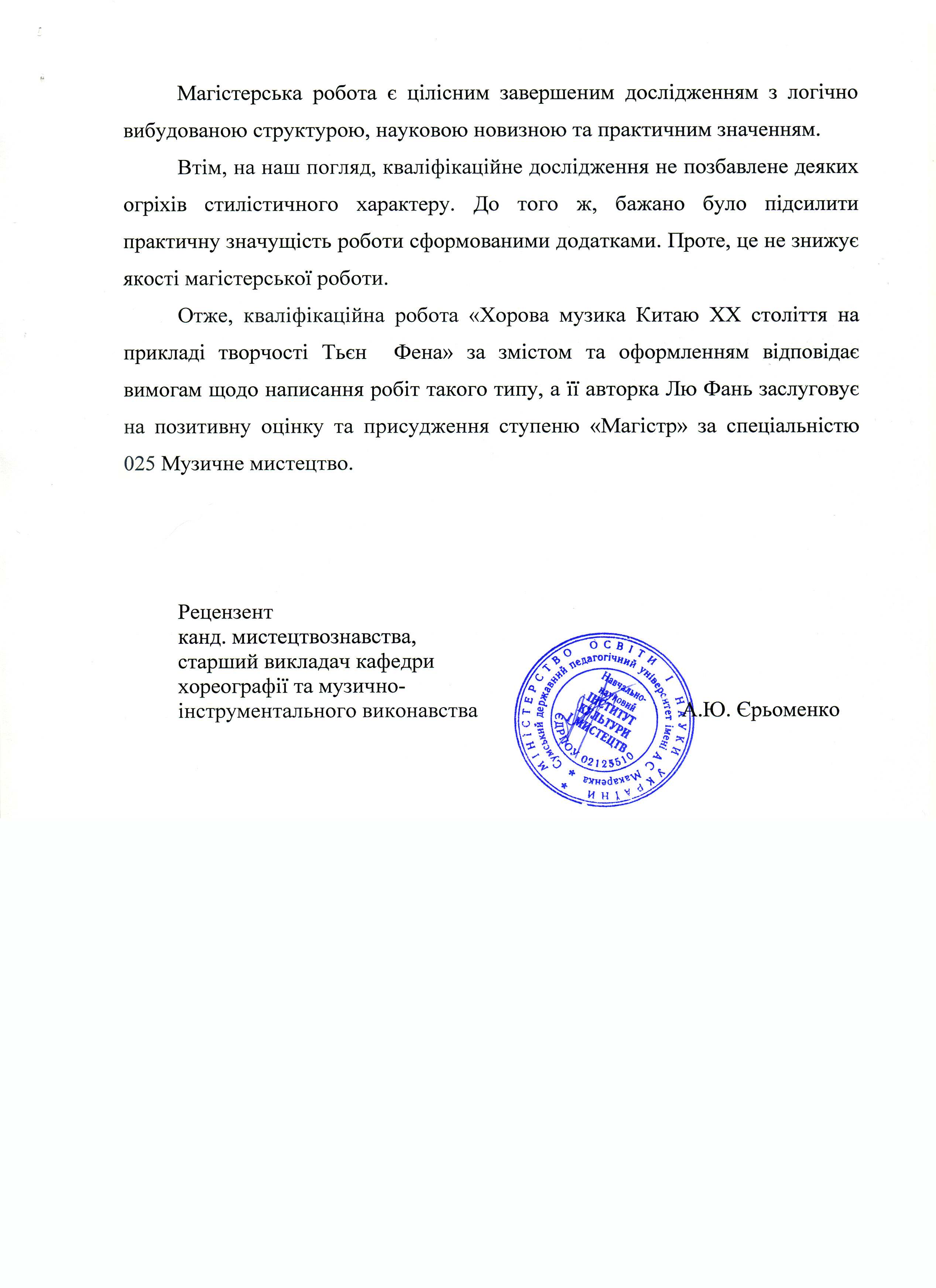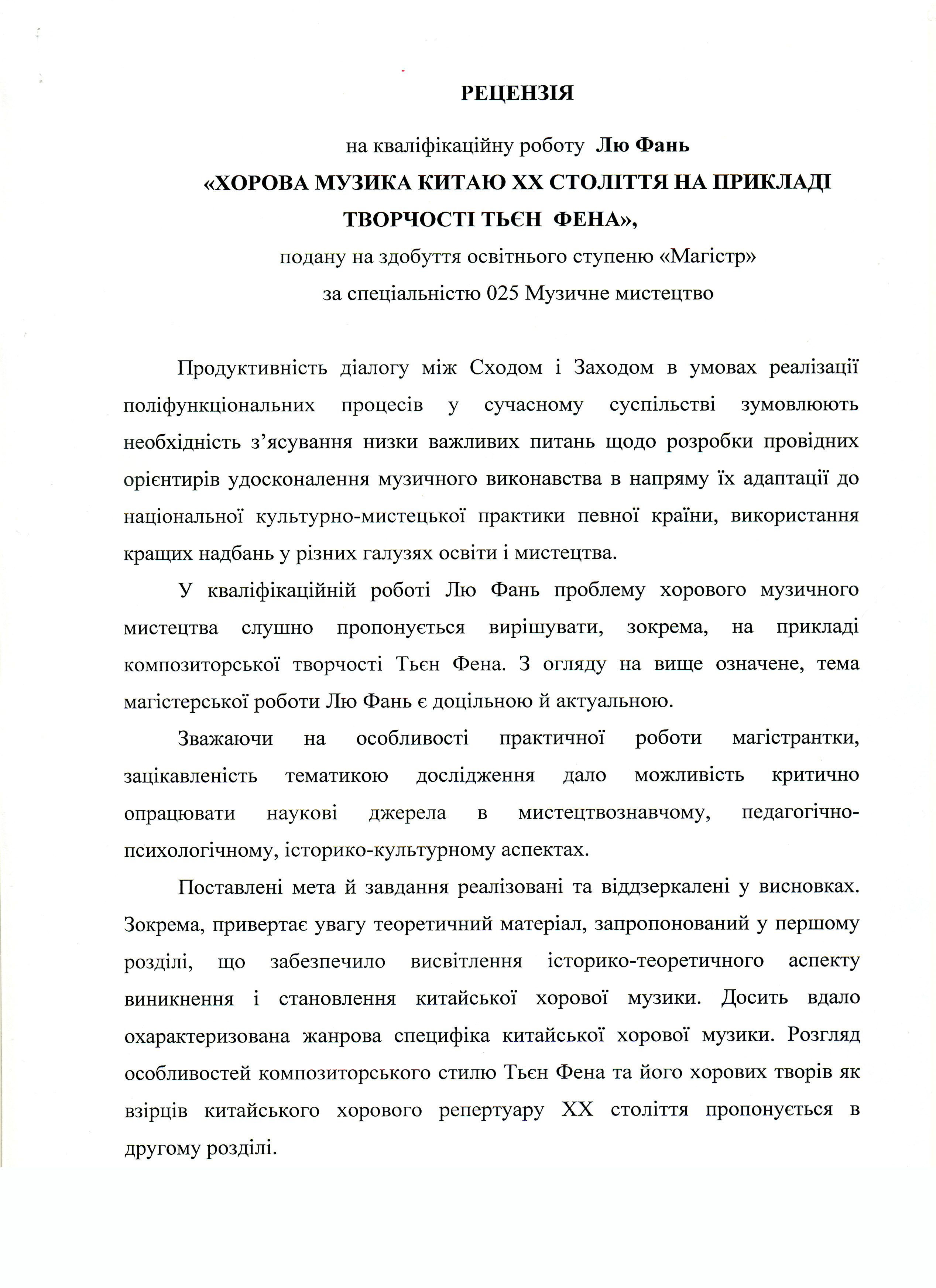 Лю Фань Хорова музика Китаю ХХ століття на прикладі творчості Тьєн Фена [Текст] : магістер. робота / Лю Фань ; науковий керівник О. В. Єременко. – Суми : СумДПУ ім. А. С. Макаренка, 2020. – 70 с.