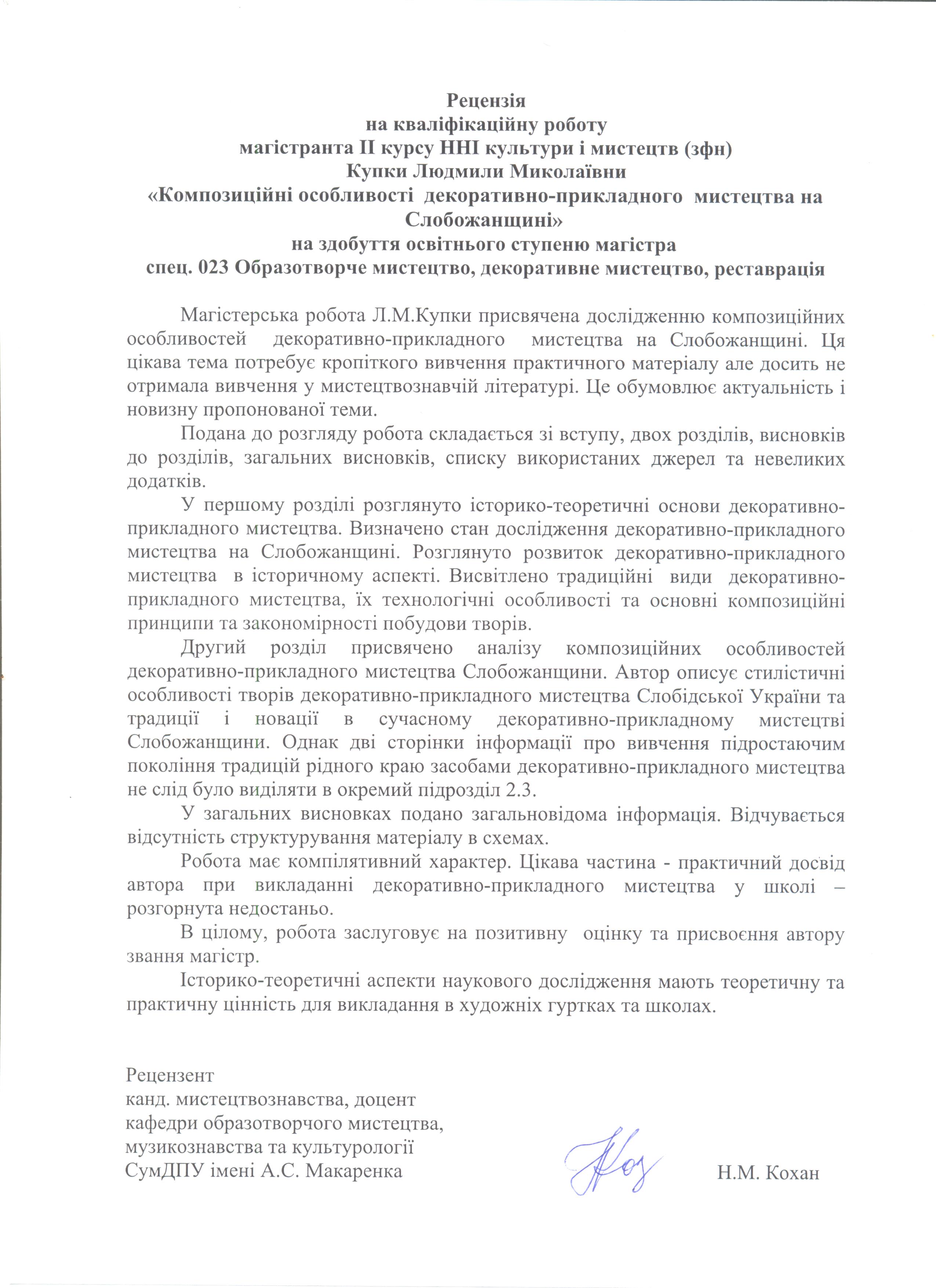 Купка, Л. М. Композиційні особливості декоративного мистецтва Слобожанщини [Текст] : магістер. робота / Л. М. Купка ; науковий керівник М. В. Жулінський. – Суми : СумДПУ ім. А. С. Макаренка, 2020. – 86 с.