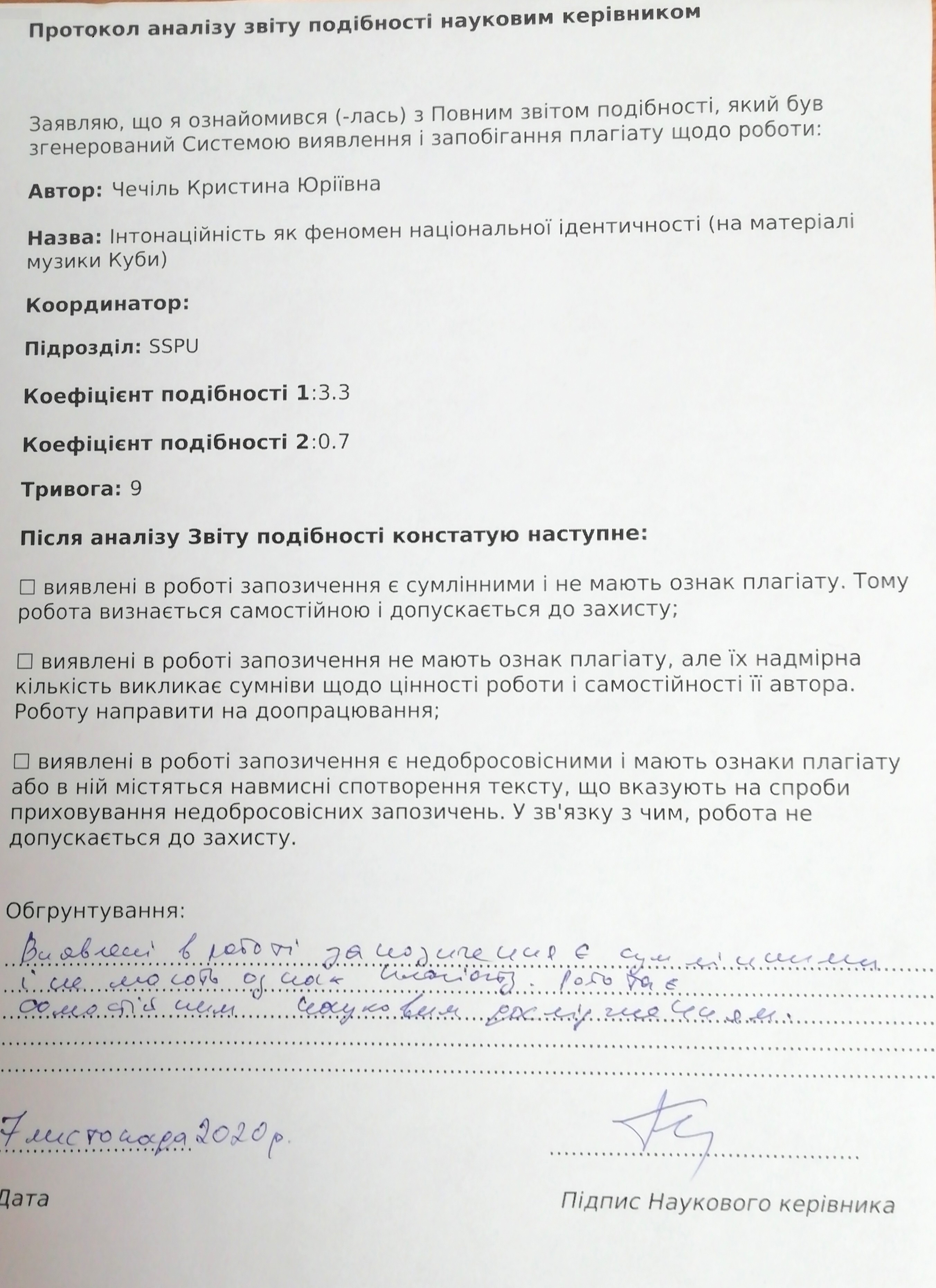 Чечіль, К. Ю. Інтонаційність як феномен національної ідентичності (за матеріалами музики Куби) [Текст] : магістер. робота / К. Ю. Чечіль ; науковий керівник Г. П. Голяка. – Суми : СумДПУ ім. А. С. Макаренка, 2020. – 62 с.