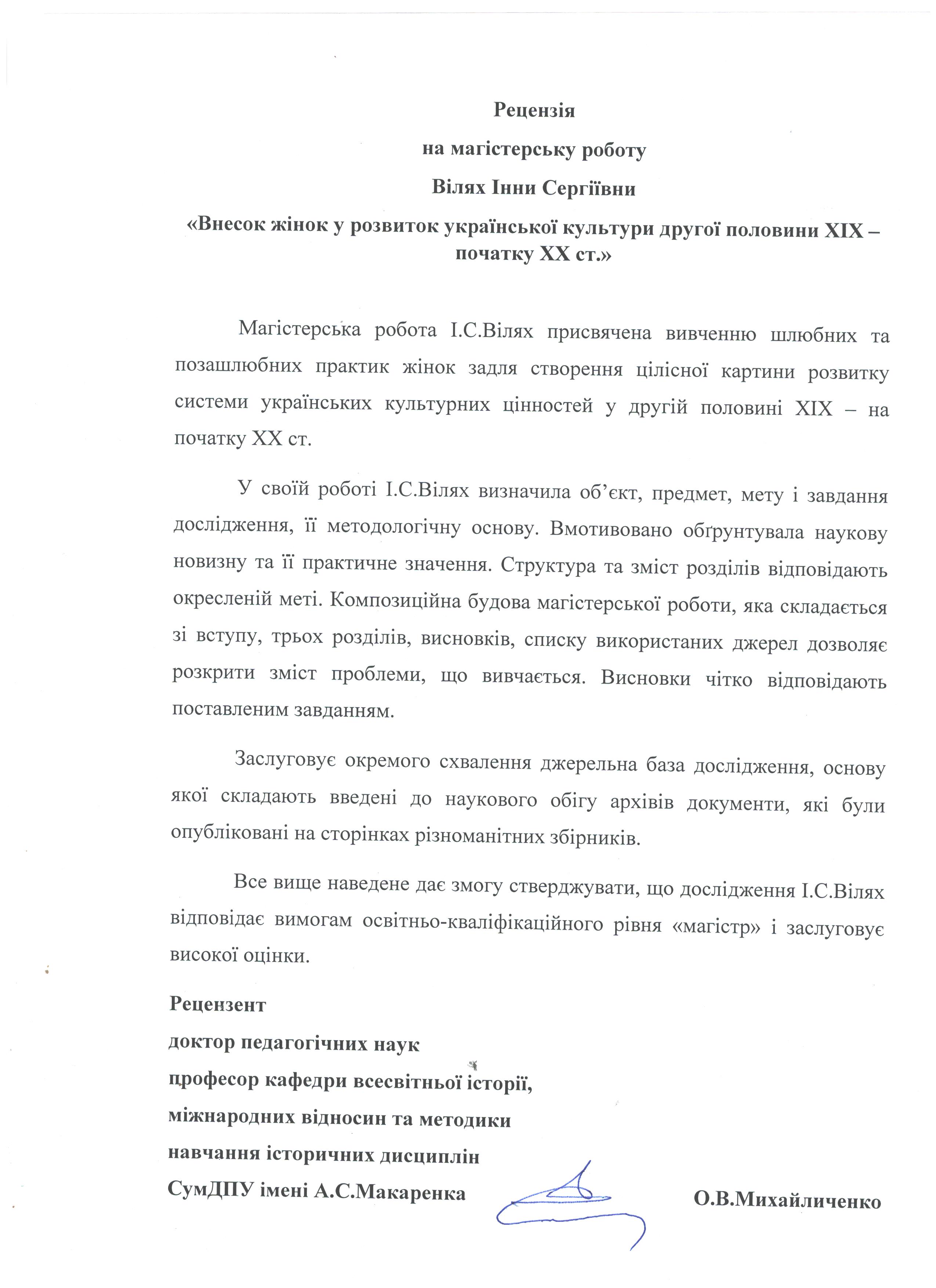 Вілях, І. С. Внесок жінок у розвиток української культури другої половини ХІХ – початку ХХ ст. [Текст] : магістер. робота / І. С. Вілях ; науковий керівник В. С. Бугрій. – Суми : СумДПУ ім. А. С. Макаренка, 2020. – 56 с.