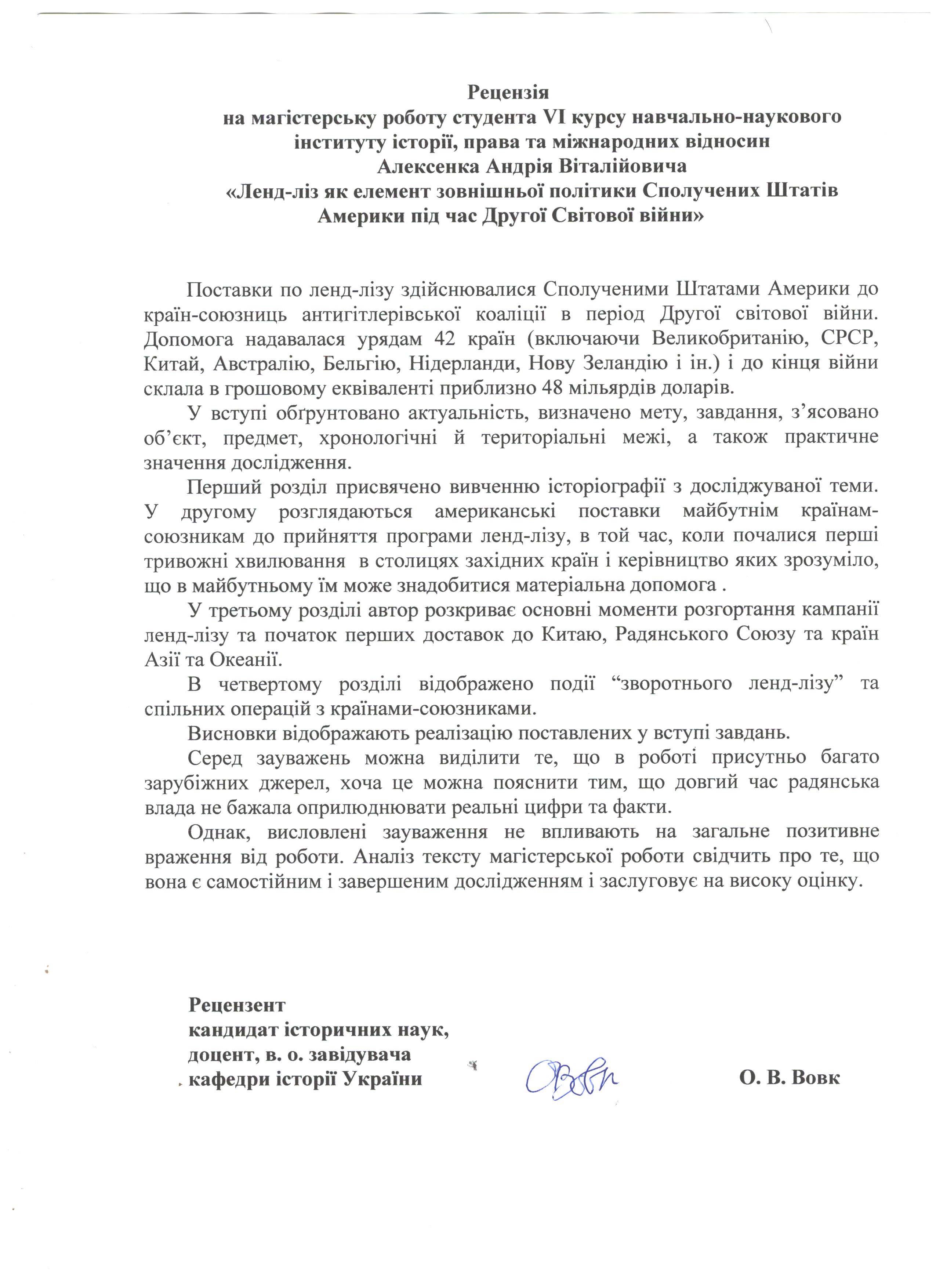 Алексенко, А. В. Ленд-ліз як елемент зовнішньої політики Сполучених Штатів Америки під час Другої світової війни [Текст] : магістер. робота / А. В. Алексенко ; науковий керівник О. В. Михайличенко. – Суми : СумДПУ ім. А. С. Макаренка, 2020. – 71 с.