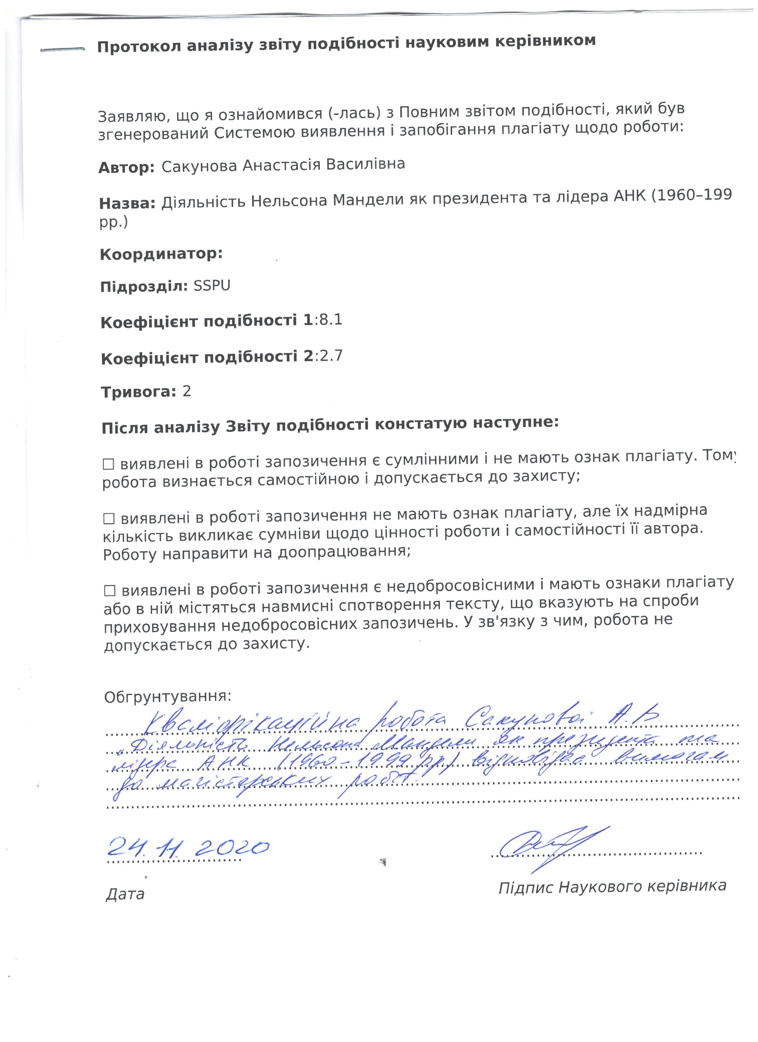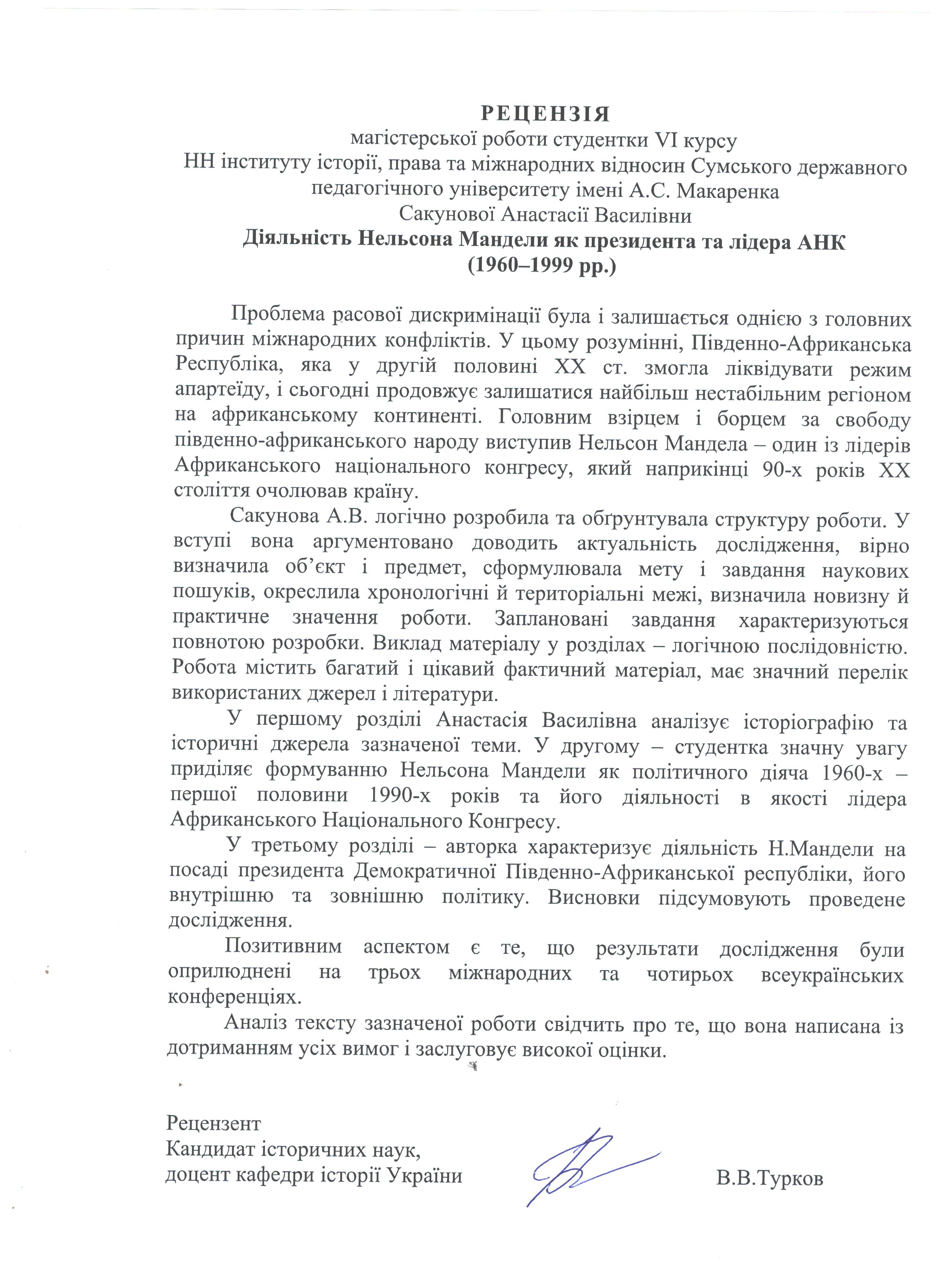 Сакунова, А. В. Діяльність Нельсона Мандели як президента та лідера АНК (1960-1999 рр.) [Текст] : магістер. робота / А. В. Сакунова ; науковий керівник В. В. Снагощенко. – Суми : СумДПУ ім. А. С. Макаренка, 2020. – 94 с.