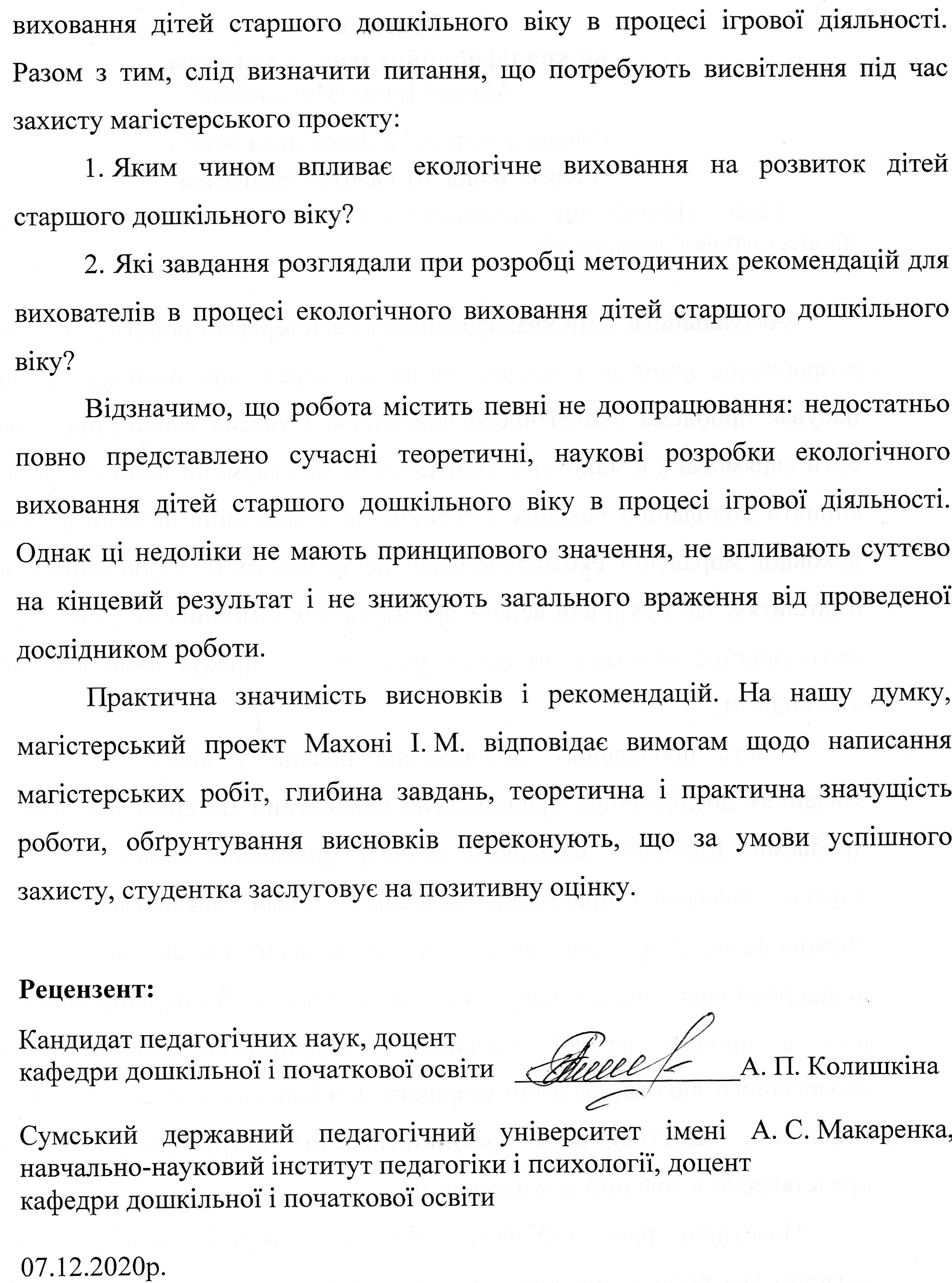 Махоня, І. М. Екологічне виховання дітей старшого дошкільного віку в процесі ігрової діяльності [Текст] : магістер. робота / І. М. Махоня ; науковий керівник О. В. Шаповалова. – Суми : СумДПУ ім. А. С. Макаренка, 2020. – 79 с.