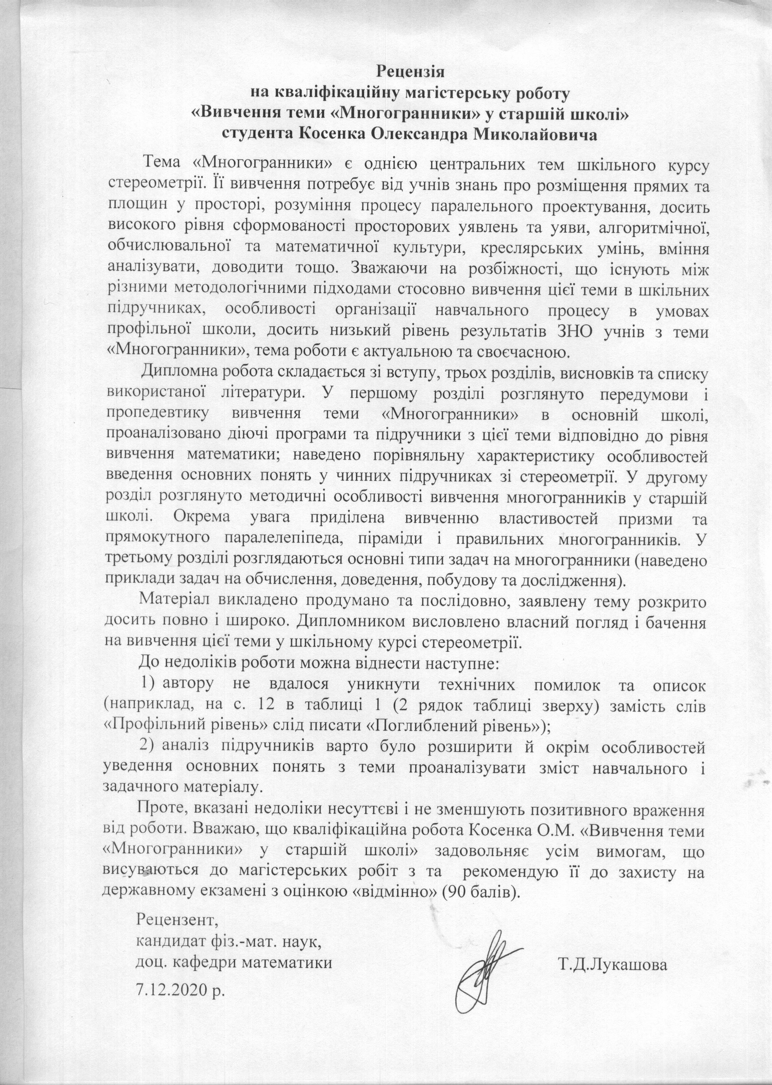 Косенко, О. М. Вивчення теми «Многогранники» у старшій школі [Текст] : магістер. робота / О. М. Косенко ; науковий керівник Ю. В. Хворостіна. – Суми : СумДПУ ім. А. С. Макаренка, 2020. – 95 с.
