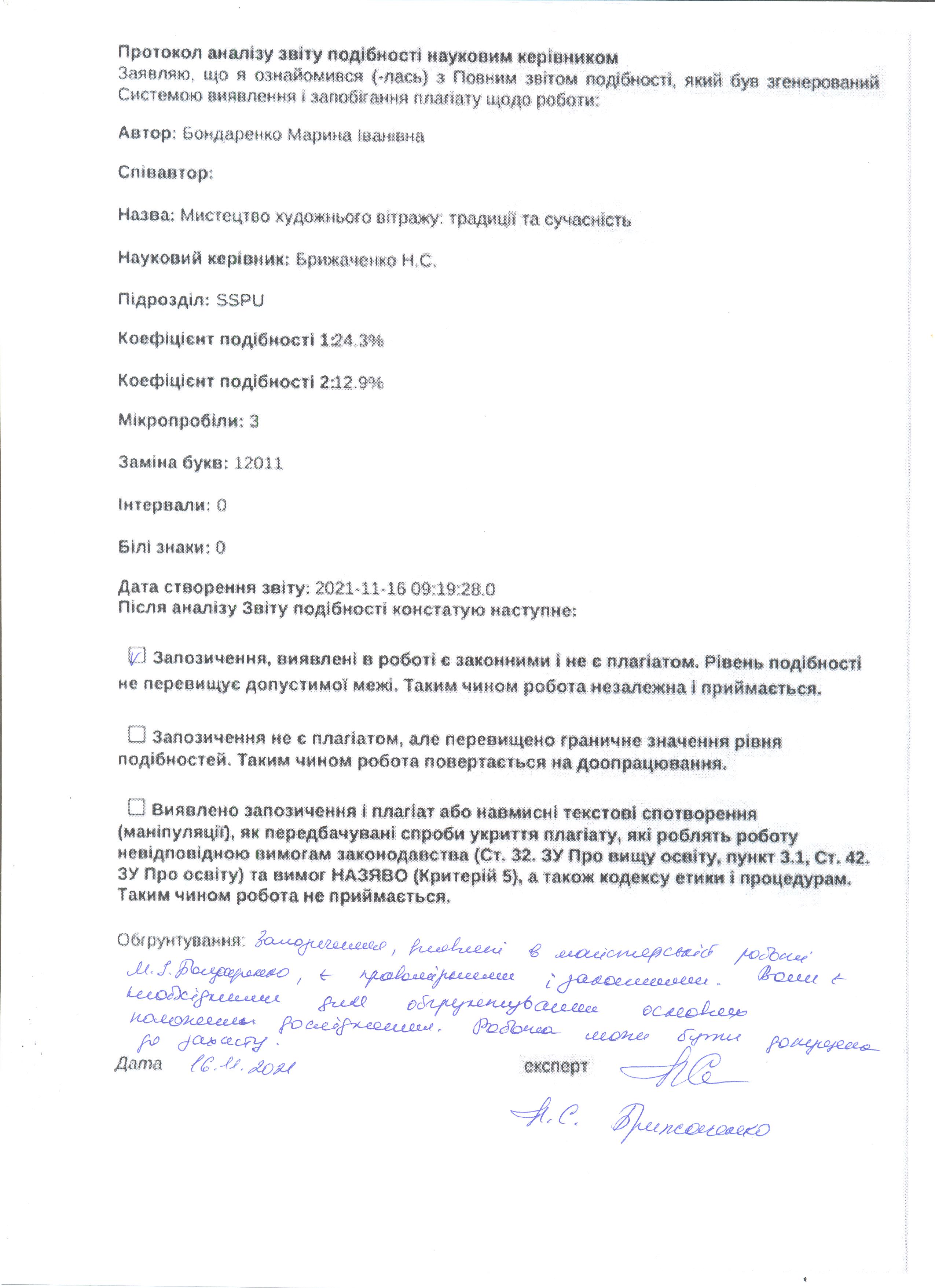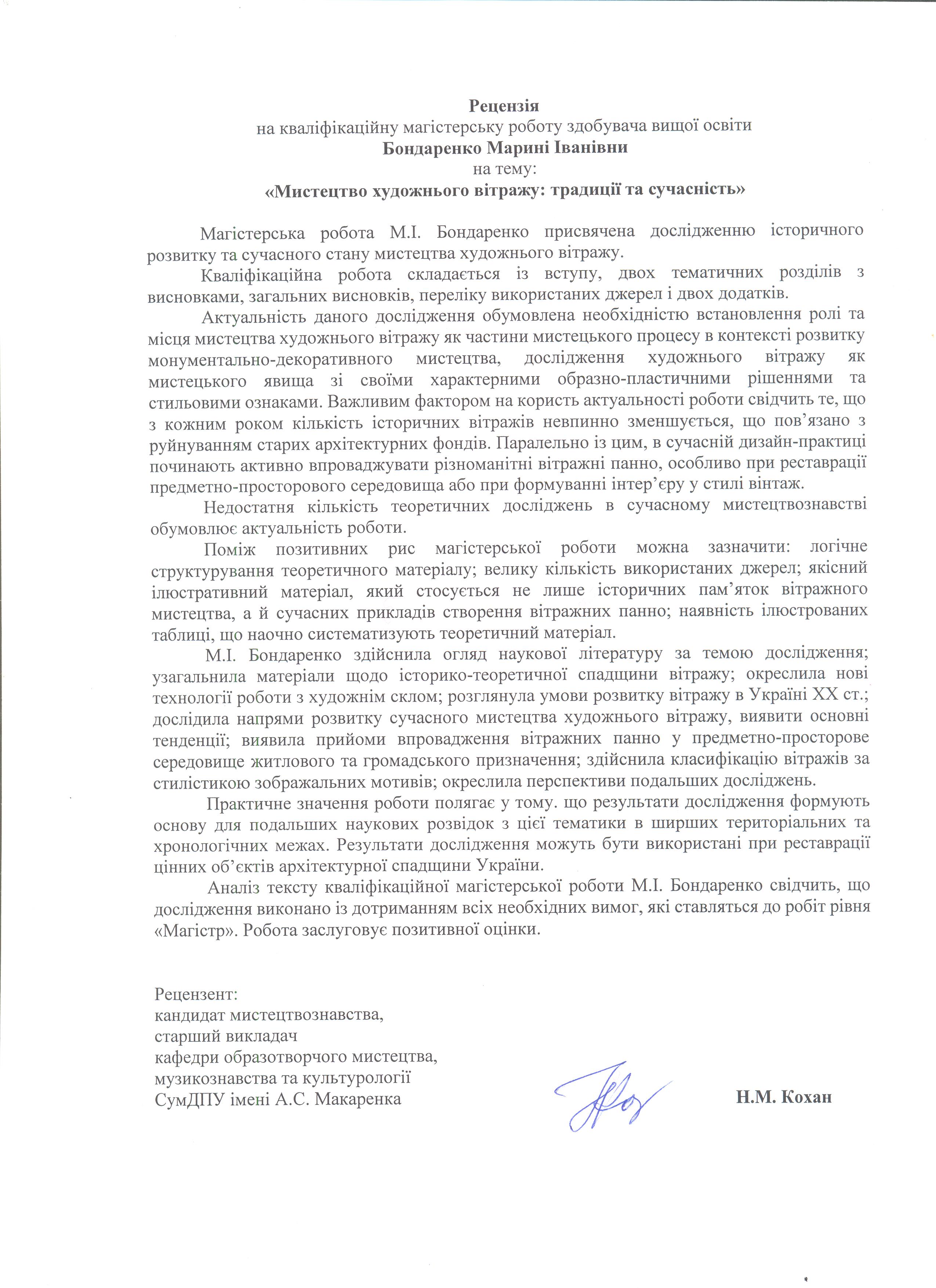 Бондаренко, М. І. Мистецтво художнього вітражу: традиції та сучасність [Текст] : кваліфікаційна робота на здобуття освітнього ступеня магістр / М. І. Бондаренко ; науковий керівник Н. Брижаченко. – Суми : СумДПУ імені А. С. Макаренка, 2021. – 92 с.