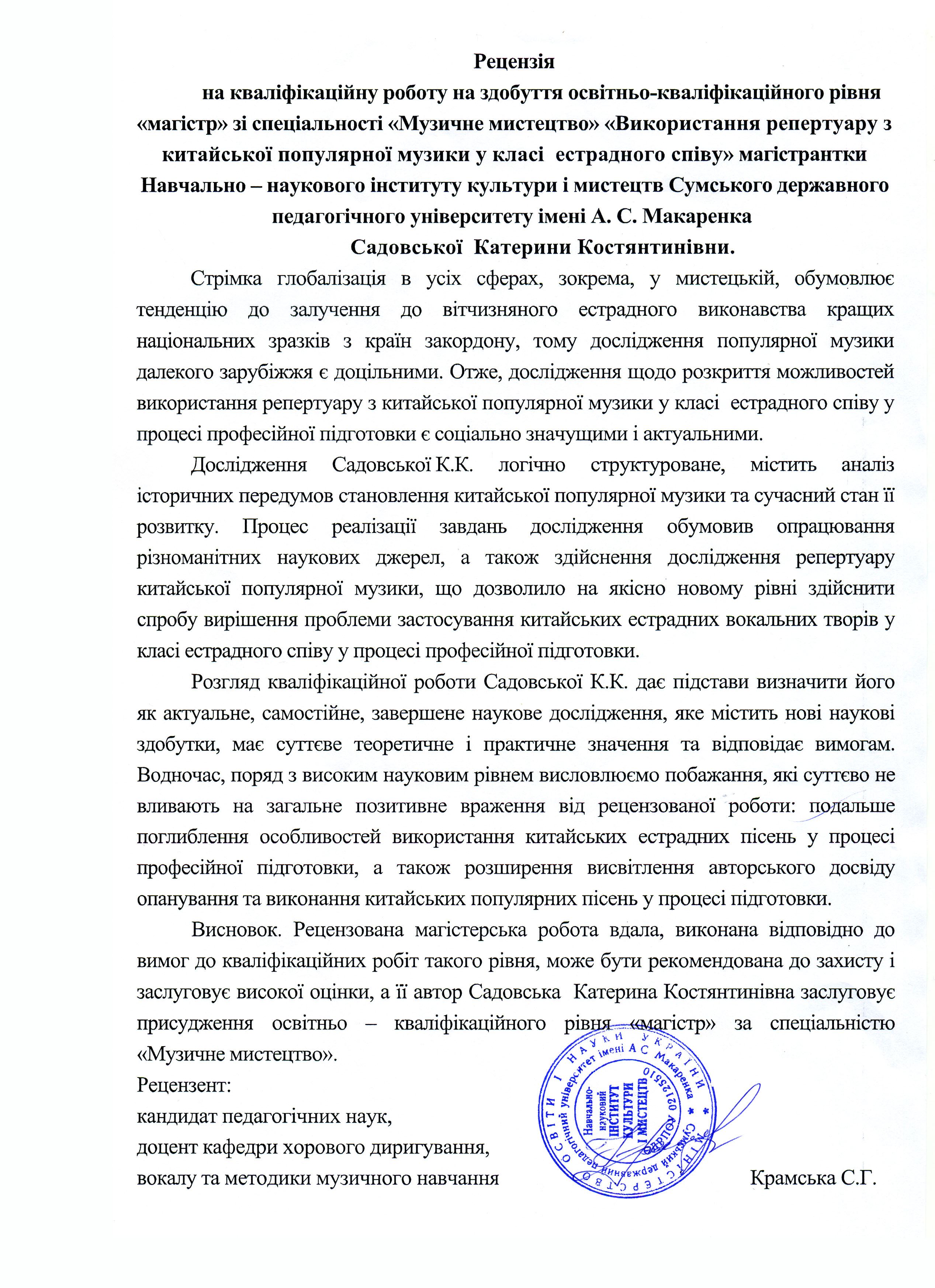 Садовська, К. К. Використання репертуару з китайської популярної музики у класі естрадного співу [Текст] : магістер. робота / К. К. Садовська ; науковий керівник Н. А. Фоломєєва. – Суми : СумДПУ ім. А. С. Макаренка, 2020. – 66 с.