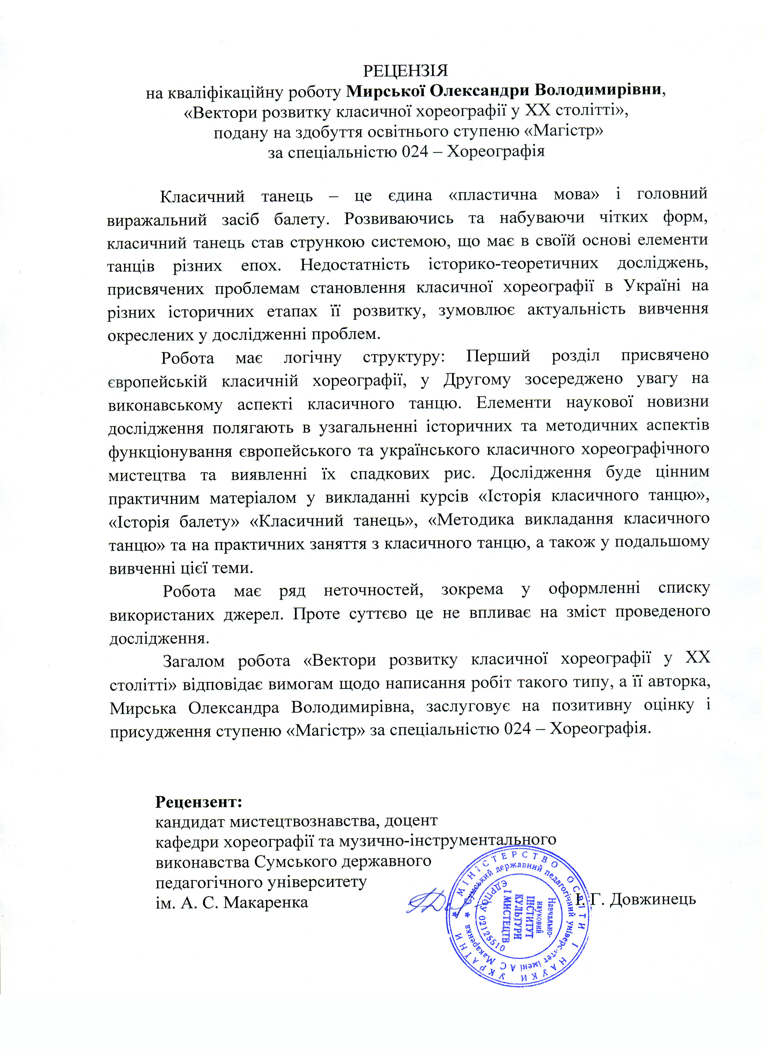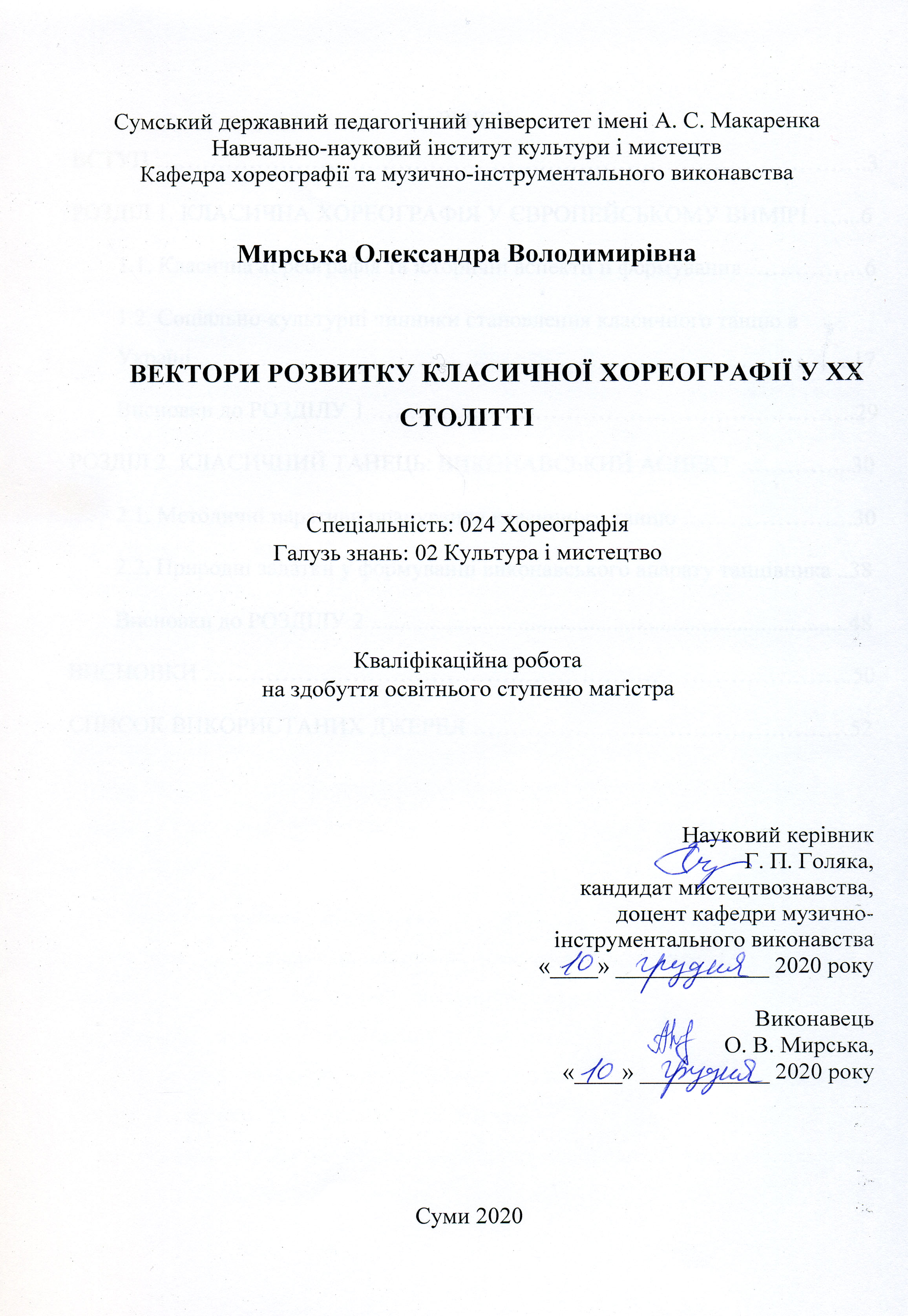 Мирська, О. В. Вектори розвитку класичної хореографії у ХХ столітті [Текст] : магістер. робота / О. В. Мирська ; науковий керівник Г. П. Голяка. – Суми : СумДПУ ім. А. С. Макаренка, 2020. – 56 с.