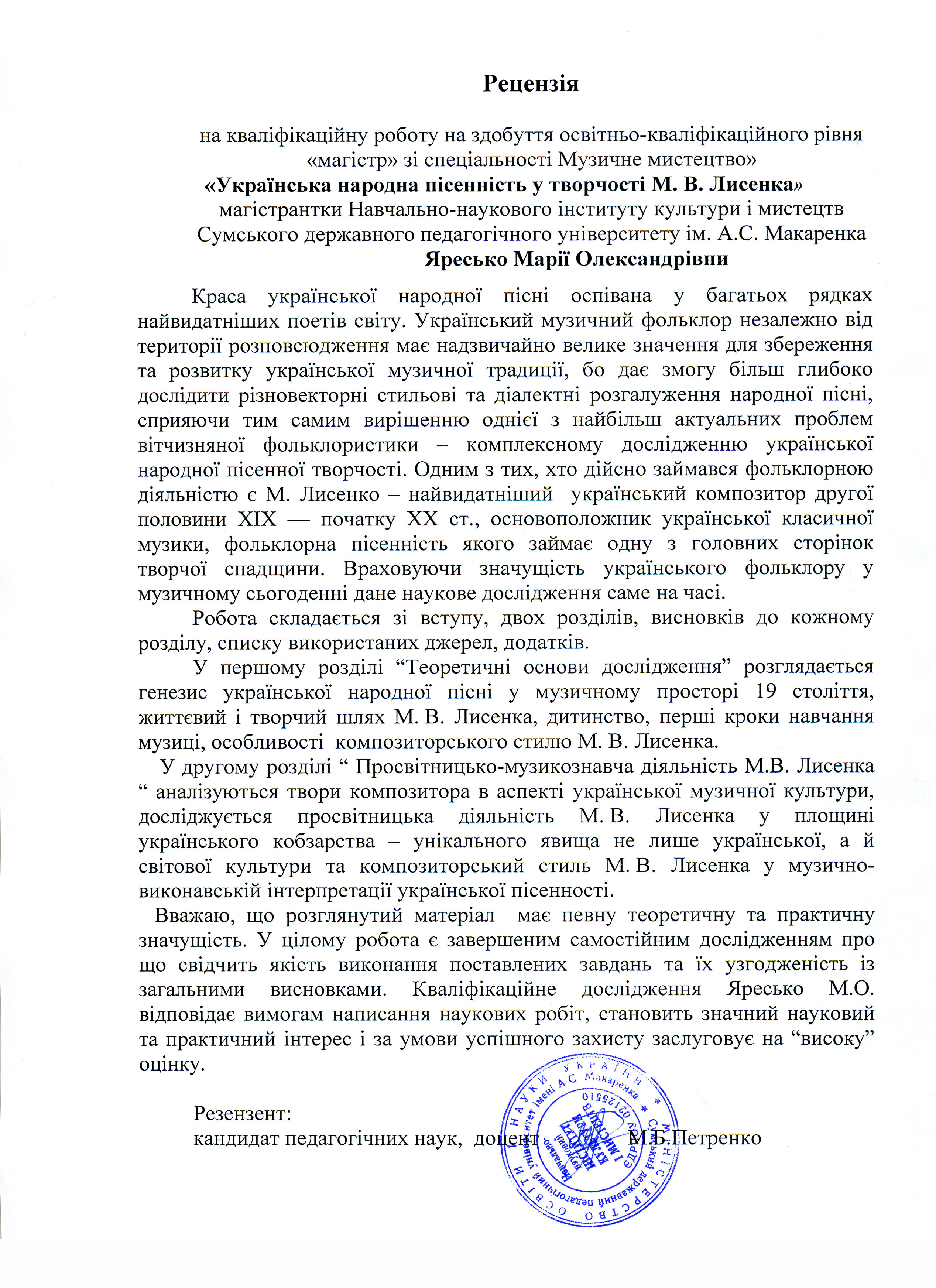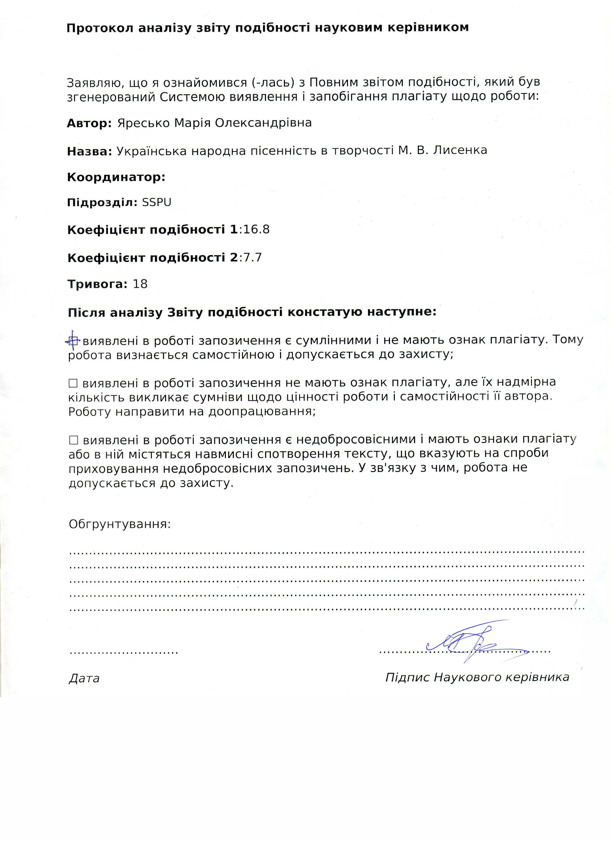 Яресько, М. О. Українська народна пісенність в творчості М. В. Лисенка [Текст] : магістер. робота / М. О. Яресько ; науковий керівник Л. А. Бірюкова. – Суми : СумДПУ ім. А. С. Макаренка, 2020. – 77 с.