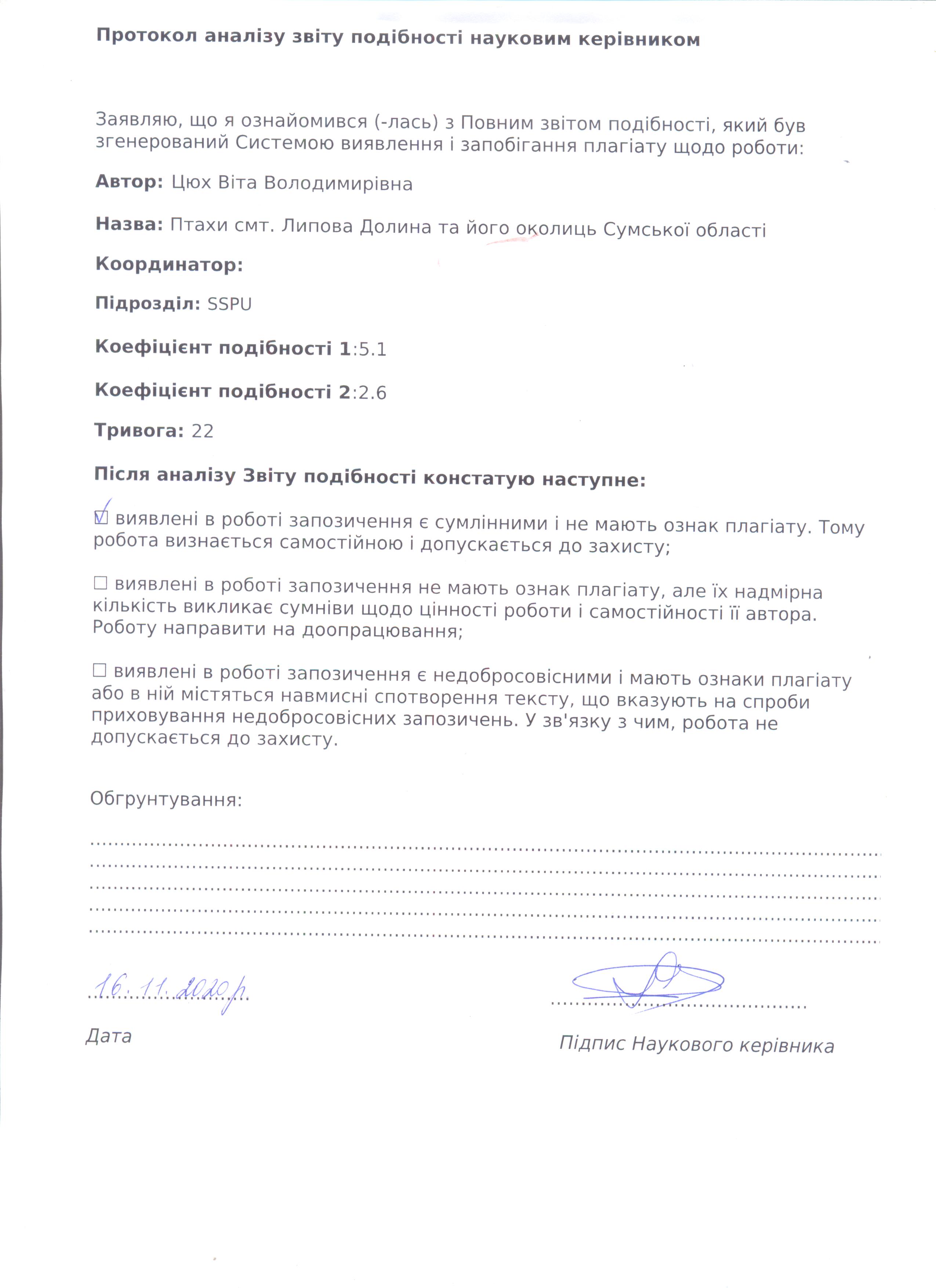 Цюх, В. В. Птахи смт. Липова Долина та його околиць Сумської області [Текст] : магістер. робота / В. В. Цюх ; науковий керівник І. Р. Мерзлікін. – Суми : СумДПУ ім. А. С. Макаренка, 2020. – 86 с.